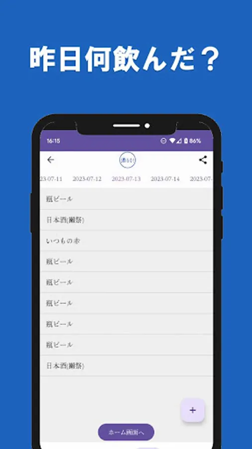 1. You can add today's drinking record from the menu displayed from the "+" button or the upper left button. It is possible to record not only alcoholic beverages but also "snacks" and "exercise". This allows you to calculate your calorie intake and calorie expenditure.