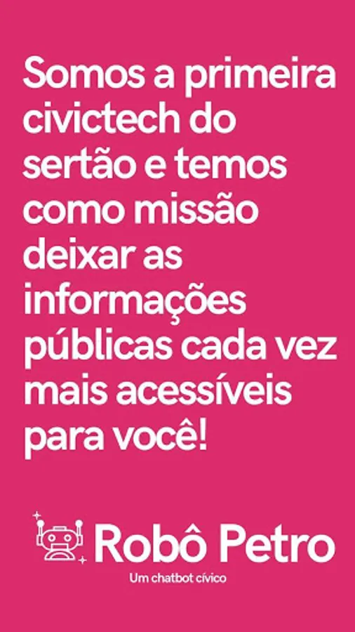 The Petro Robot is the first civictech in the Pernambuco backlands and its main mission is to make public information increasingly accessible to the population. We believe that information is for everyone and, since it is so, nothing better than having an app so that you can have access to all of that!