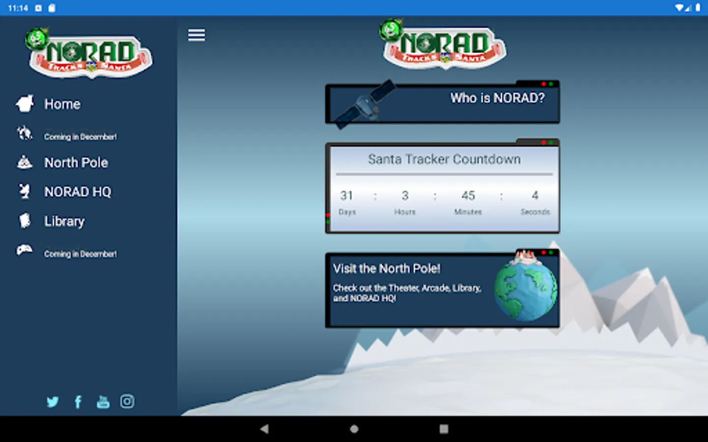 The NORAD Santa App is the official app of the NORAD Tracks Santa program. Watch the days countdown to the start of Santa's Yuletide journey around the world! You can also play games, read stories and more!