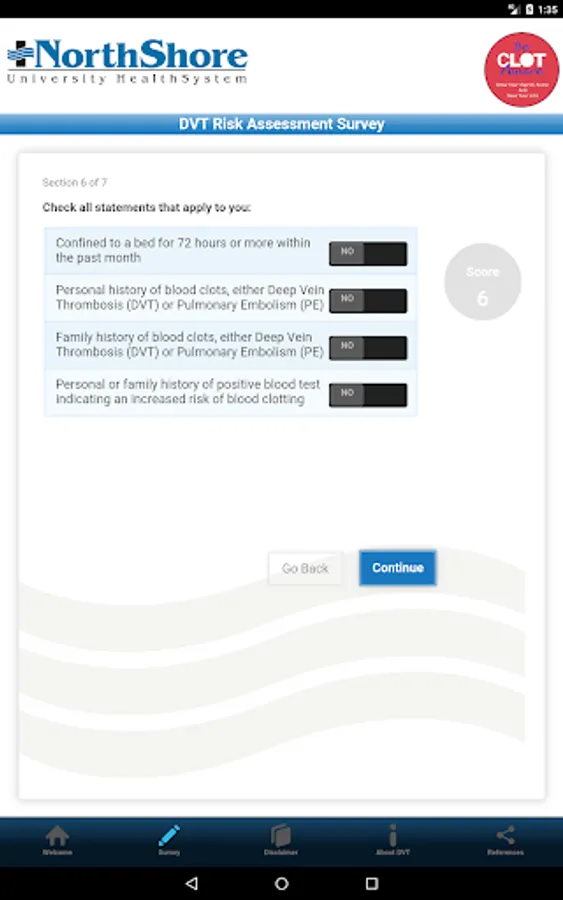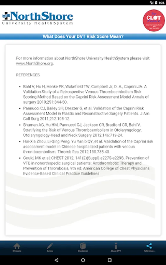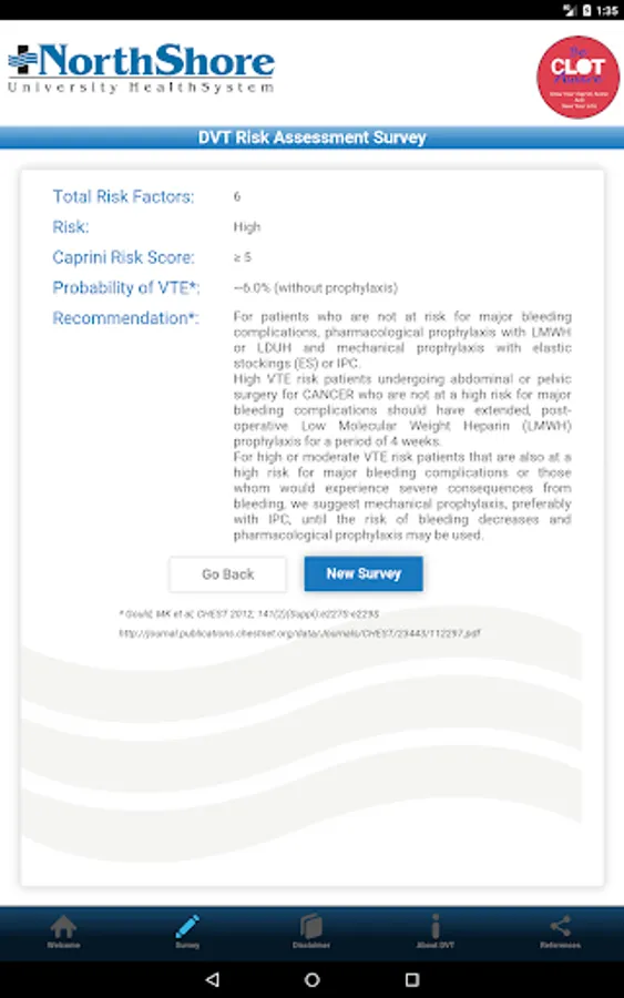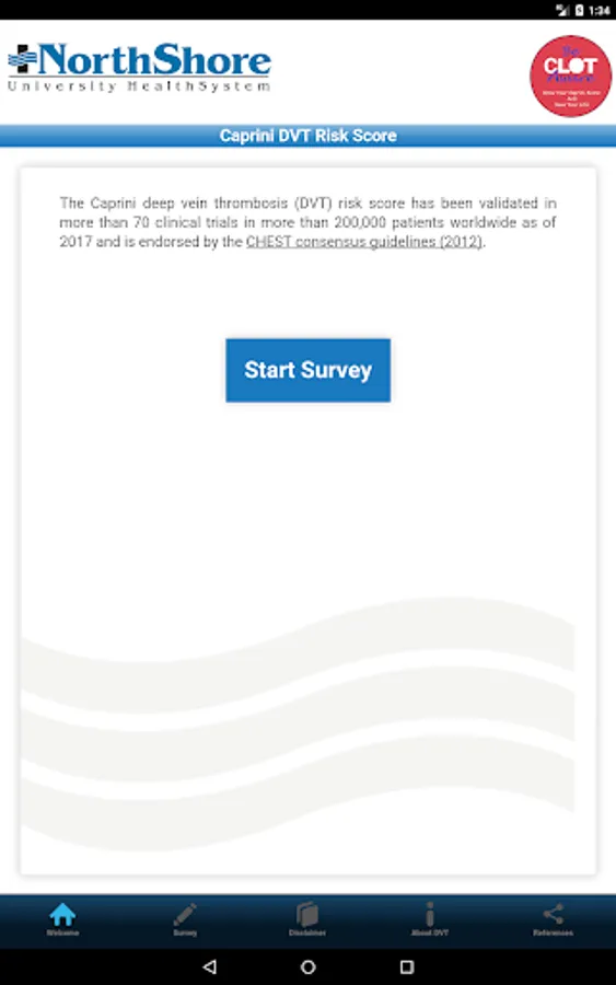 The Caprini deep vein thrombosis (DVT) risk score has been validated in more than 70 clinical trials in at least 200,000 patients worldwide as of 2017 and is endorsed by the Chest Consensus Guidelines (2012).