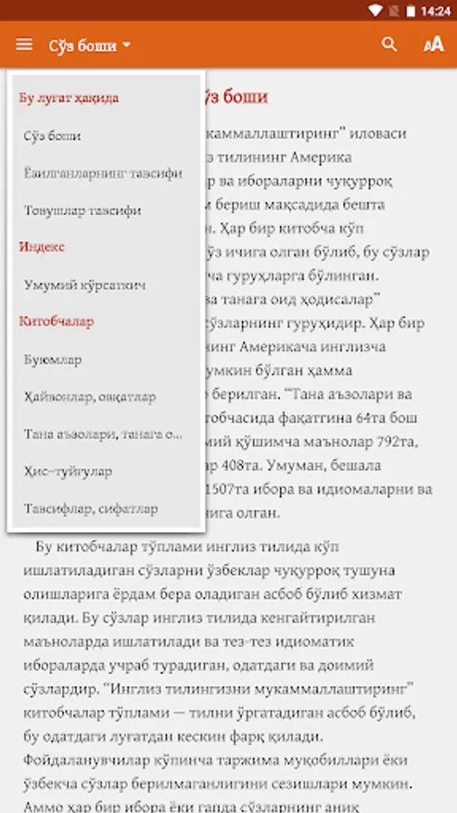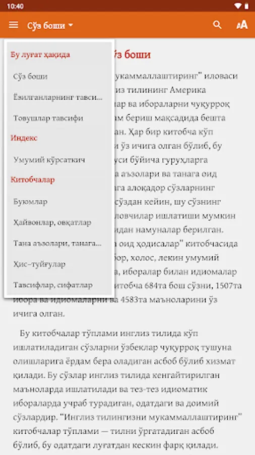 “Ingliz tilingizni mukammallashtiring” ilovasi oʻzbek talabalariga ingliz tilining Amerika shevasidagi doimiy soʻzlar va iboralarni chuqurroq tushuna olishlariga yordam berish maqsadida beshta kitobcha shaklida tuzilgan. Har bir kitobcha koʻp ishlatiladigan soʻzlarni oʻz ichiga olgan boʻlib, bu soʻzlar ishlatilish mavzusi boʻyicha guruhlarga boʻlingan. Masalan, “Tana aʼzolari va tanaga oid hodisalar” mavzusi tanaga aloqador soʻzlarning guruhidir. Har bir bosh soʻzdan keyin, shu soʻzning Amerikacha inglizcha soʻzlovchilar ishlatishi mumkin boʻlgan hamma maʼnolaridan namunalar berilgan. “Tana aʼzolari va tanaga oid hodisalar” kitobchasida faqatgina 64ta bosh soʻz bor, xolos, lekin umumiy qoʻshimcha maʼnolar 792ta, iboralar bilan idiomalar 408ta. Umuman, beshala kitobcha 684ta bosh soʻzni, 1507ta ibora va idiomalarni va 4583ta maʼnolarini oʻz ichiga olgan.