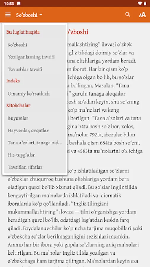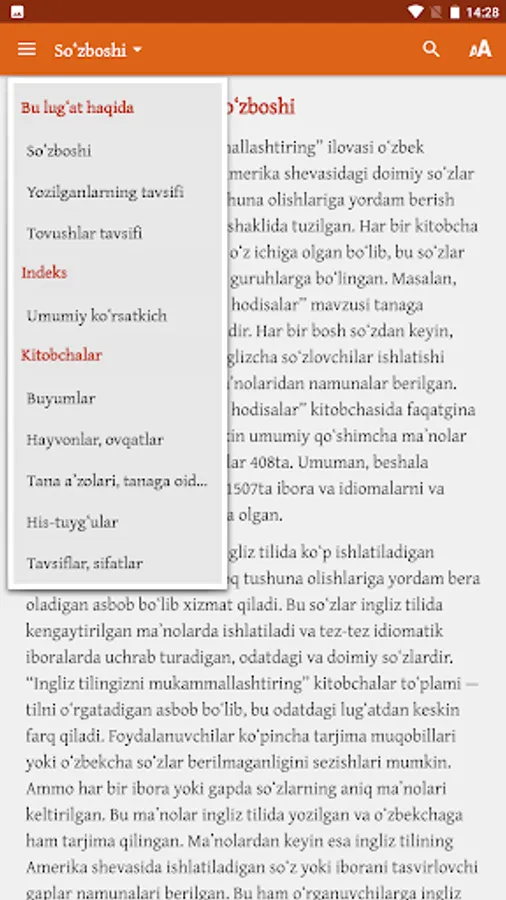 “Ingliz tilingizni mukammallashtiring” ilovasi o'zbek talabalariga ingliz tilining Amerika shevasidagi doimiy soʻzlar va iboralarni chuqurroq tushuna olishlariga yordam berish maqsadida beshta kitobcha shaklida tuzilgan. Har bir kitobcha koʻp ishlatiladigan soʻzlarni oʻz ichiga olgan boʻlib, bu soʻzlar ishlatilish mavzusi boʻyicha guruhlarga boʻlingan. Masalan, “Tana aʼzolari va tanaga oid hodisalar” mavzusi tanaga aloqador soʻzlarning guruhidir. Har bir bosh soʻzdan keyin, shu soʻzning Amerikacha inglizcha soʻzlovchilar ishlatishi mumkin boʻlgan hamma maʼnolaridan namunalar berilgan. “Tana aʼzolari va tanaga oid hodisalar” kitobchasida faqatgina 64ta bosh soʻz bor, xolos, lekin umumiy qoʻshimcha maʼnolar 792ta, iboralar bilan idiomalar 408ta. Umuman, beshala kitobcha 684ta bosh soʻzni, 1507ta ibora va idiomalarni va 4583ta maʼnolarini oʻz ichiga olgan.