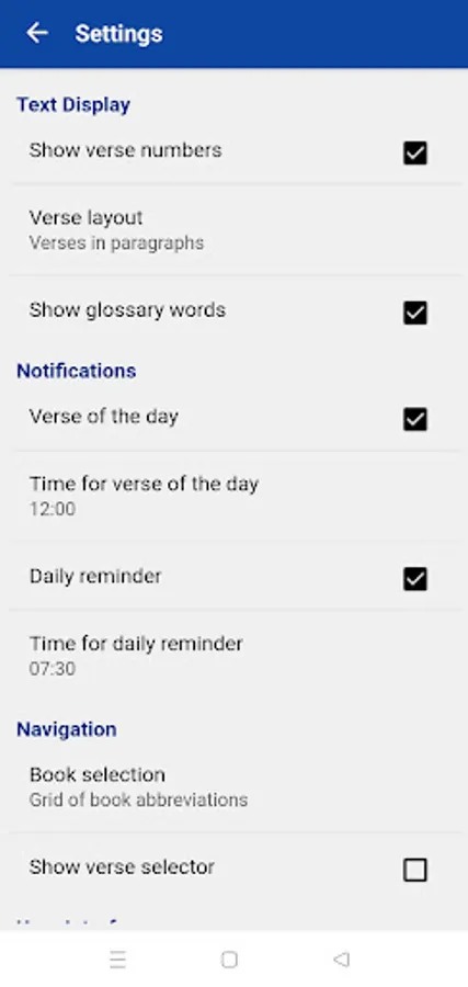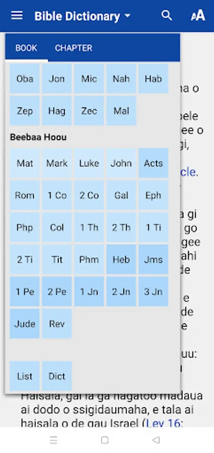 An alphabetic glossary provides short explanations of many Biblical names and other terms. The glossary can be found in the main menu below the Bible books (tap the tile "Glos"). Glossary articles can also be accessed from within the Bible text by clicking on any word or phrase in blue.