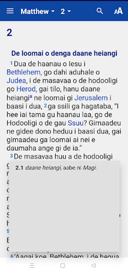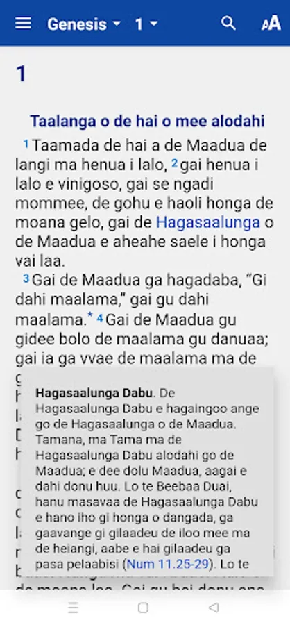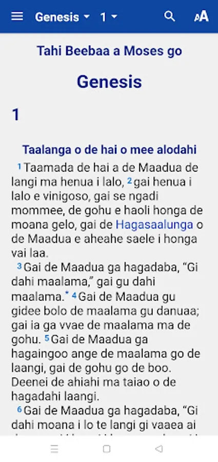 This app contains the full Bible, translated in the Nukuoro language (spoken in the Federated States of Micronesia), in the Protestant canon (66 books). This translation was made by a team of Nukuoro speakers and was finalized in 2022.