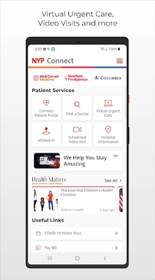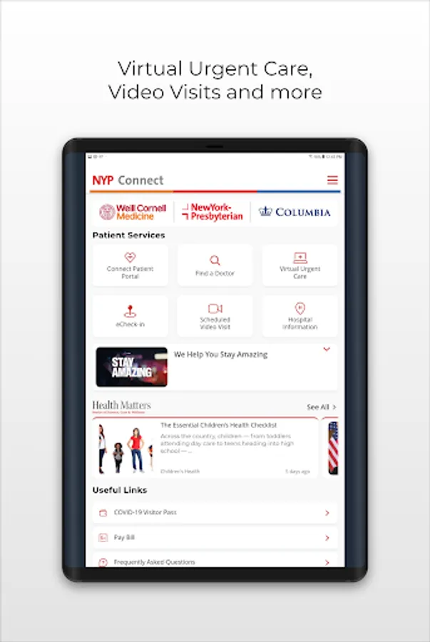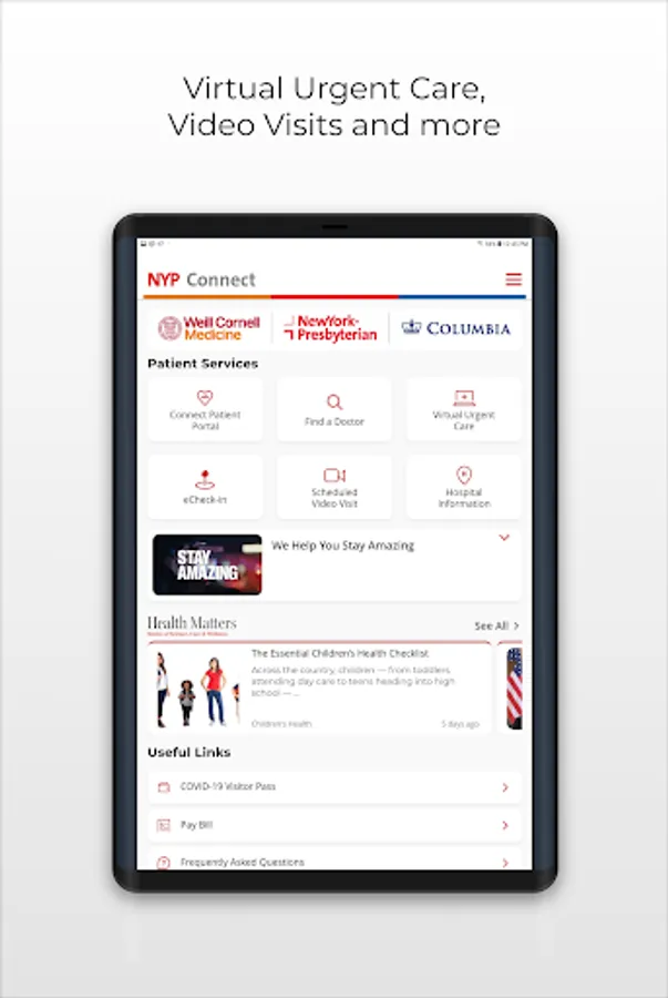 NYP Connect brings world-class care right to your fingertips, whether on-the-go, at home, or when visiting one of our locations. You can easily connect with the experts from Columbia and Weill Cornell Medicine 7 days a week for your health care needs with services such as Virtual Urgent Care, Video Visits and more, all available on your mobile or tablet device.