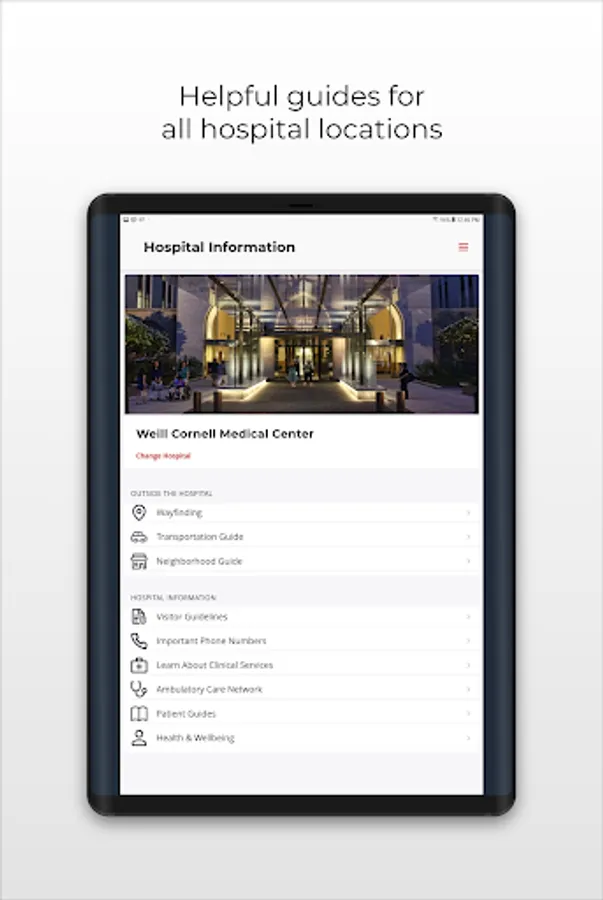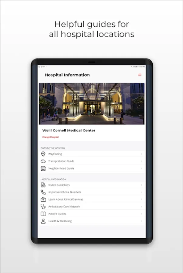 Hospital Guides: Enhance your visit or stay at any NewYork-Presbyterian hospital. Access important phone numbers, transportation & patient guides, navigation tools to help you find your way around, and more.