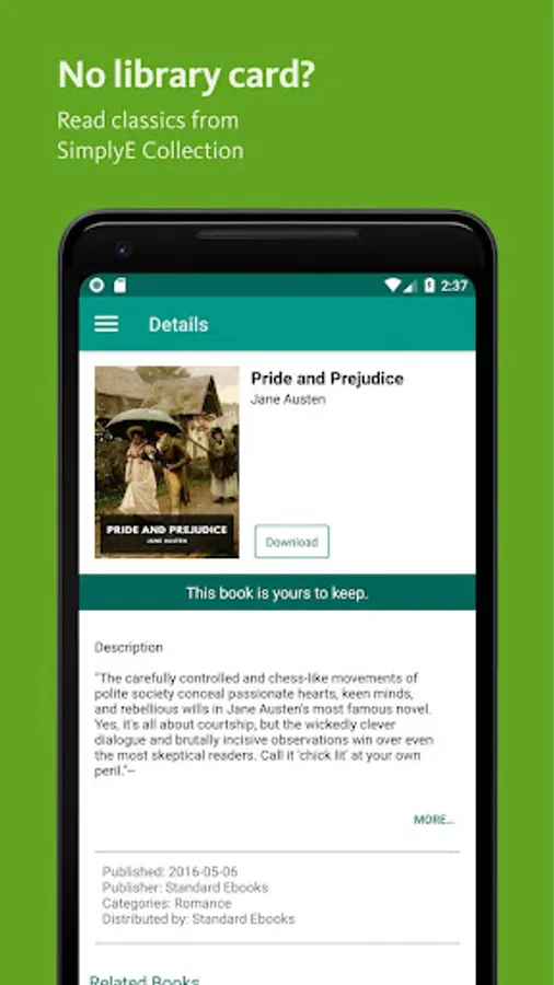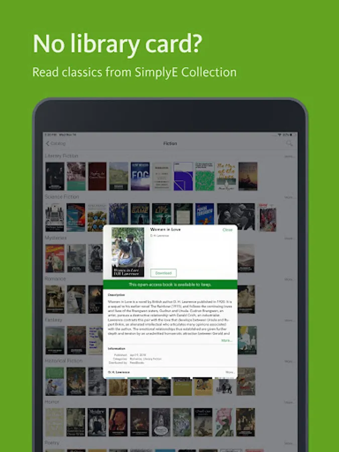 Don’t have a library card? No problem. Thousands of public domain classics and open access ebooks are available as soon as you download the app, no library card required. Tap the button below "Books for All" to start reading!