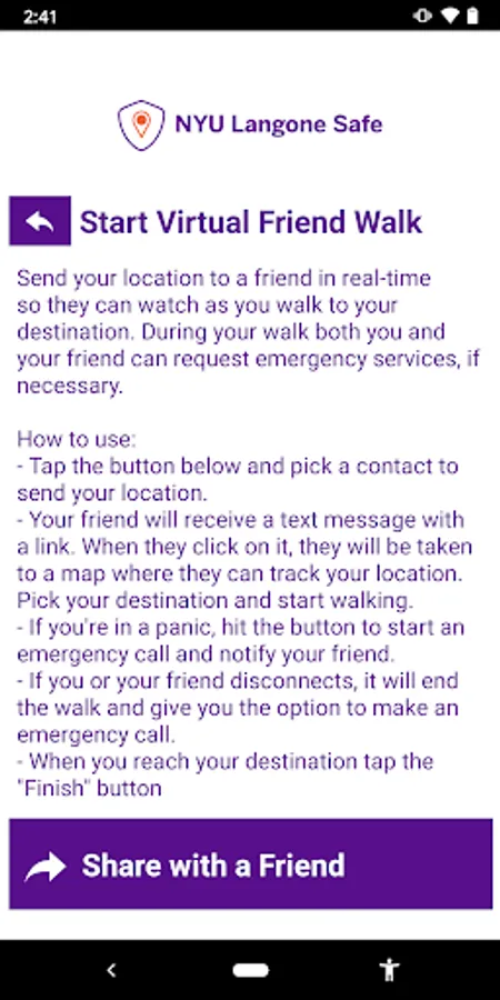 - Virtual Friend Walk: Send your location to a friend through email or SMS on your device. Once the friend accepts the Friend Walk request, the user picks their destination and their friend tracks their location in real time; they can keep an eye on them to make sure they make it safely to their destination.