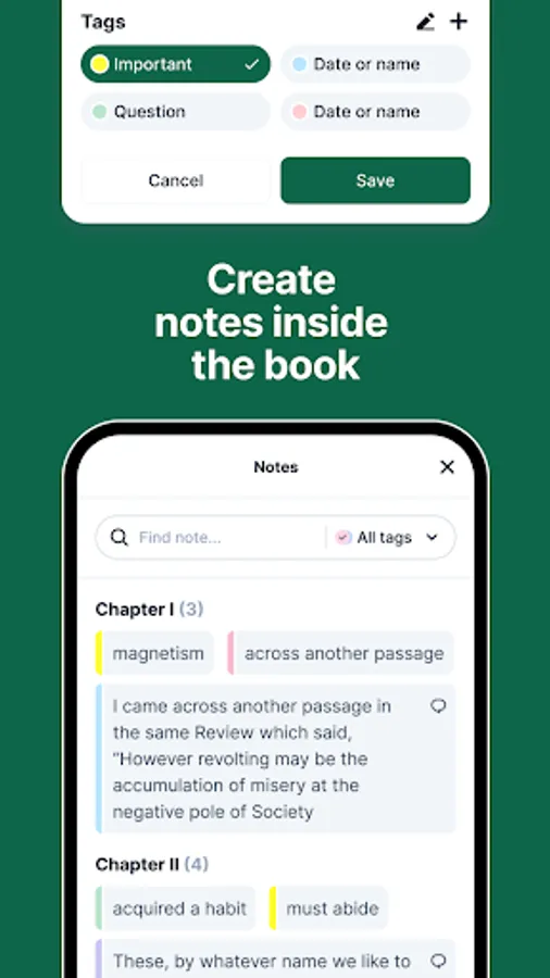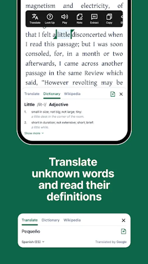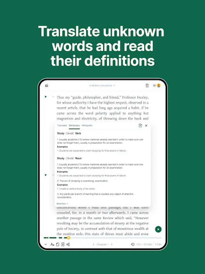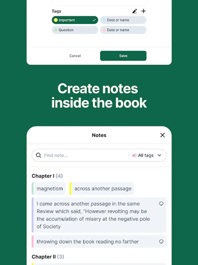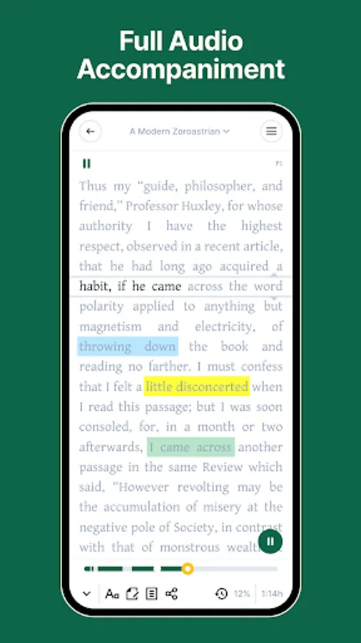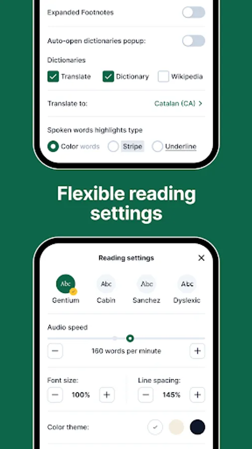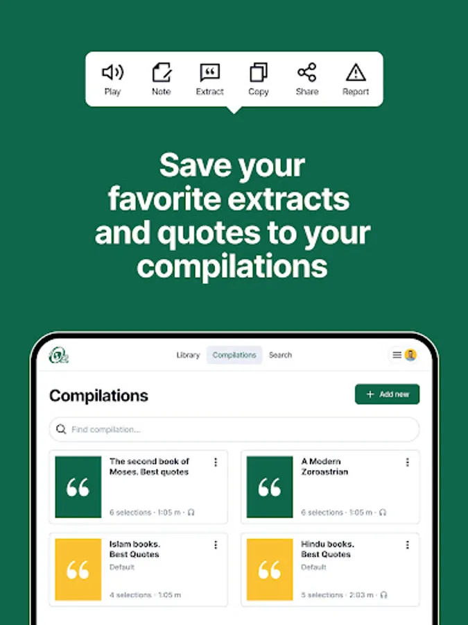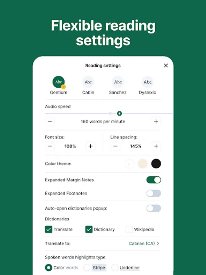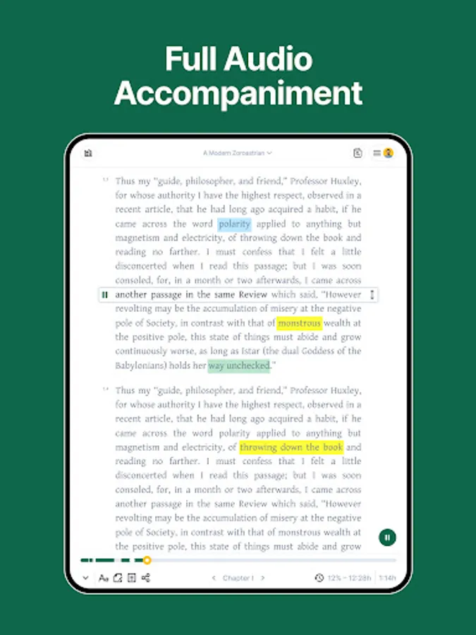 Immersive reading with integrated audio synchronized across all your devices with note-taking, compilation building and sharing tools.