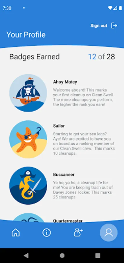 Once you download Clean Swell, you will need a valid email address to set up an account. Your privacy is very important to us, so rest assured that we’ll always keep your details secure. https://oceanconservancy.org/privacy-policy/
