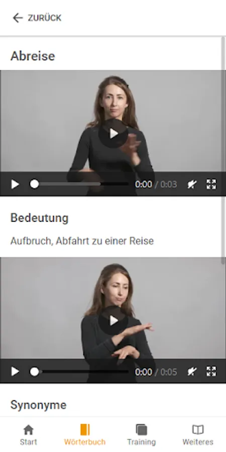 Find and search the word list. Watch videos with the translation of word and meaning into sign language.