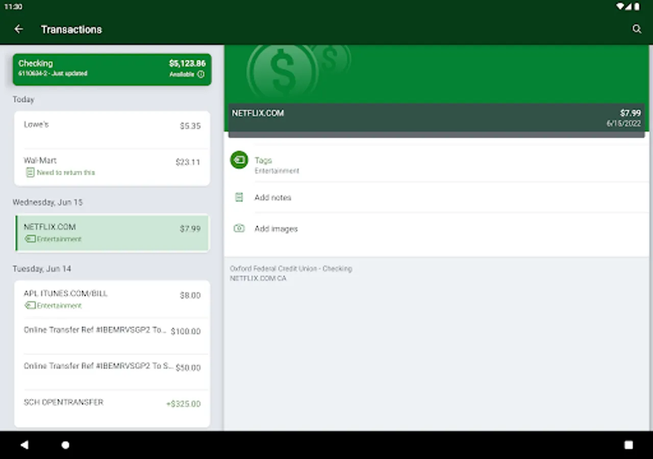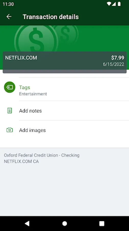 - Keep your transactions organized by allowing you to add tags, notes and photos of receipts and checks.