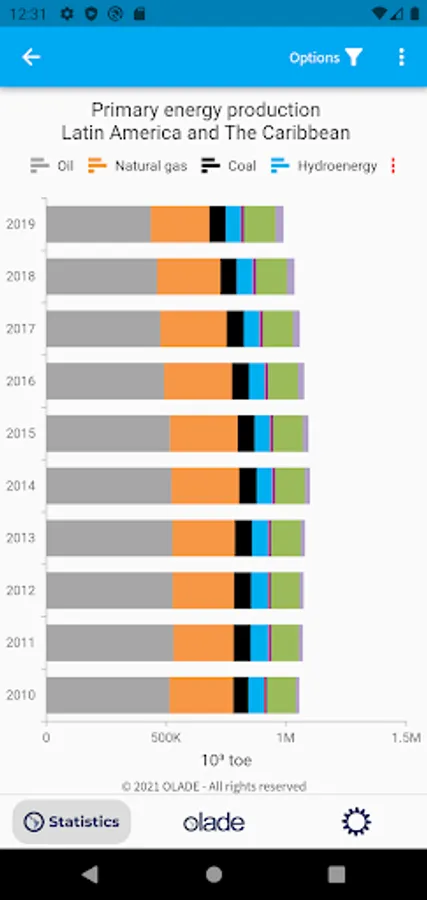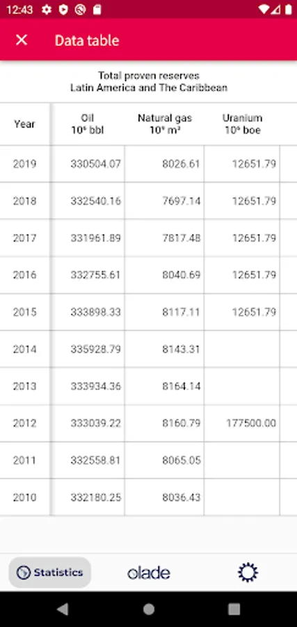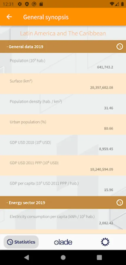 This App contains the most relevant statistics of the energy sector of the 27 countries of Latin America and the Caribbean, Members of the Latin American Energy Organization – OLADE. The information is organized by subject, easily accessible, and includes national, and regional data for the last 10 years.