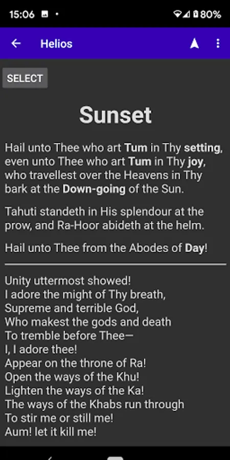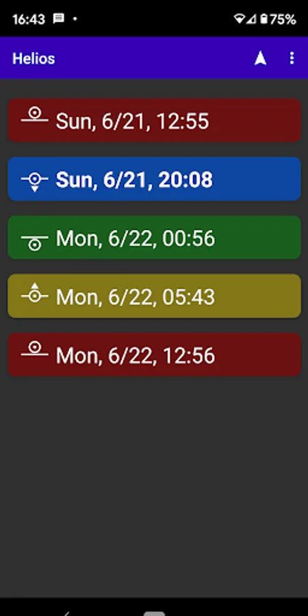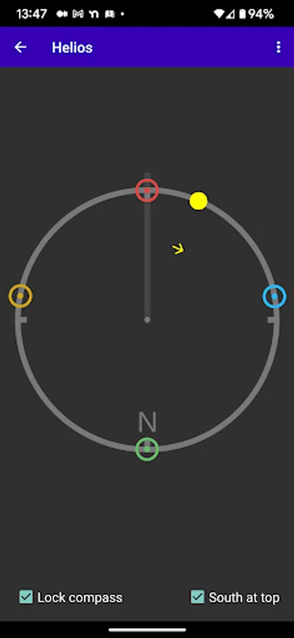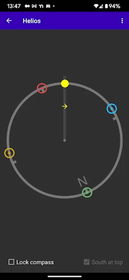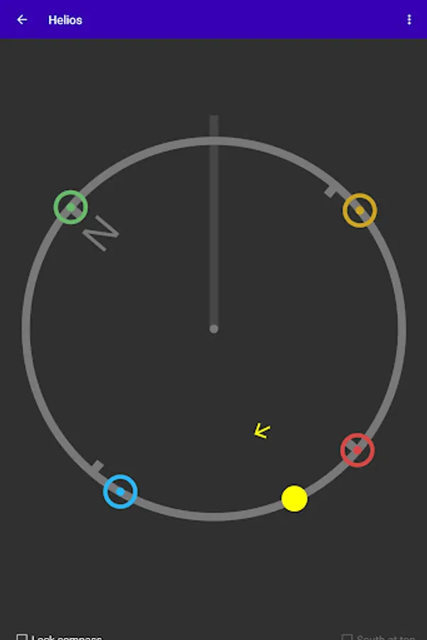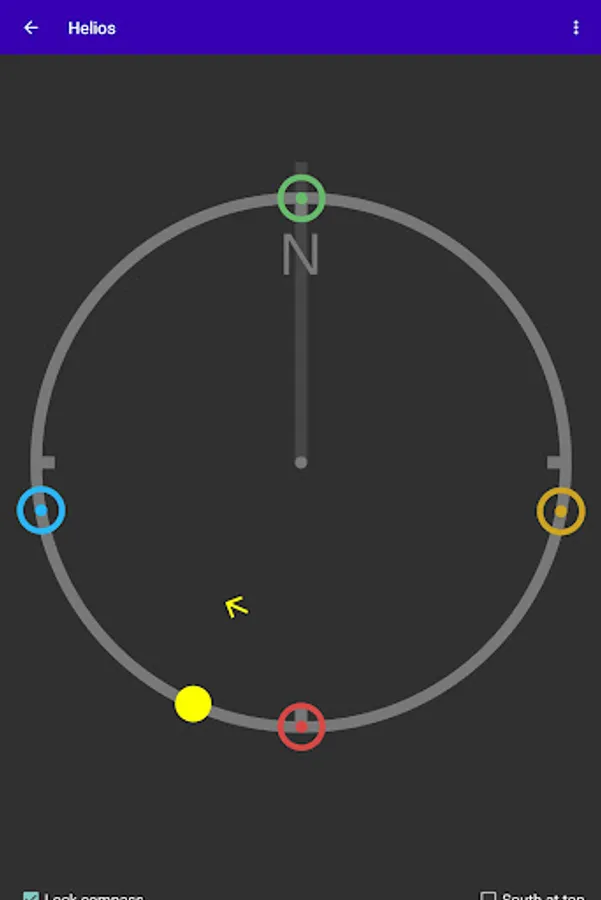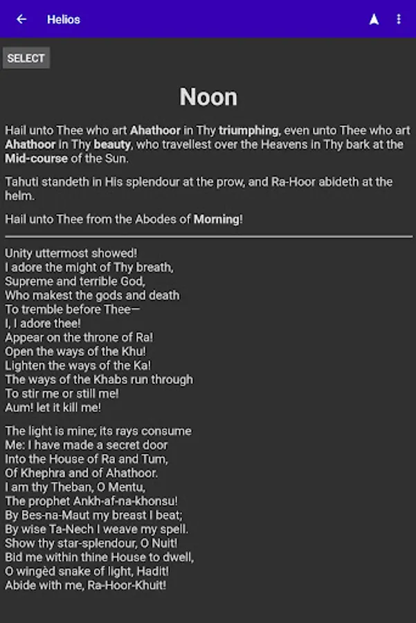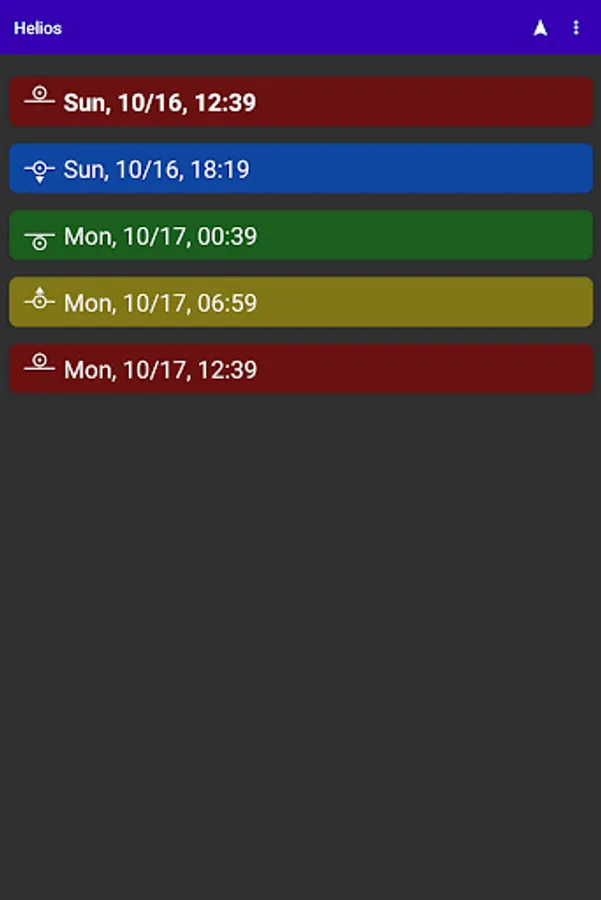 The Thelemic practice of Liber Resh involves four adorations of the Sun each day, at sunrise, noon, sunset, and midnight. Helios assists with this practice by providing a list of the most recent and four upcoming adoration times, the text for each adoration, and a compass display showing the direction to each of the upcoming four adorations.