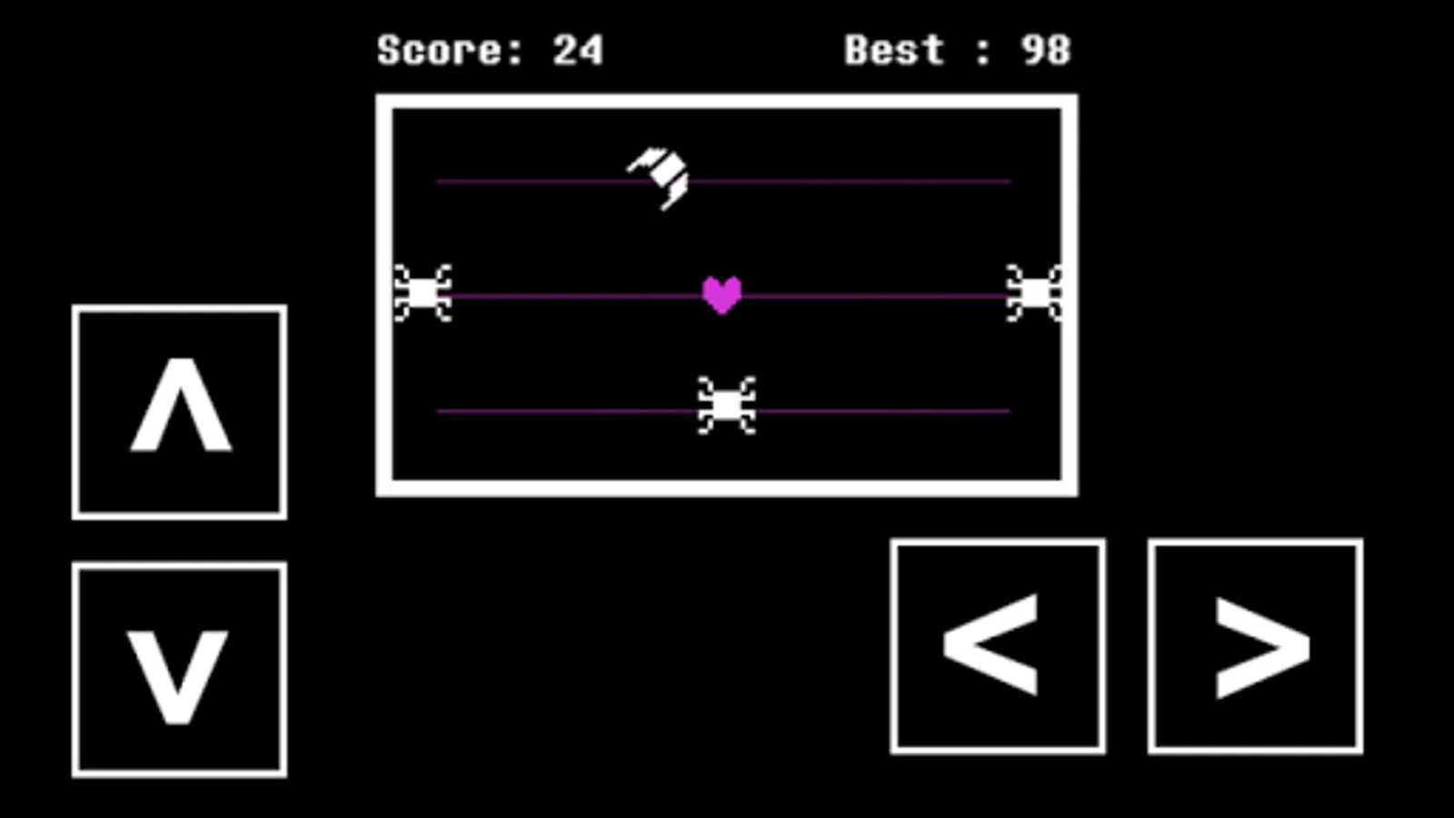 Struggling into a spider web, you have to avoid avoid spiders, croissants and donuts coming from the right and left and try to do the best score.