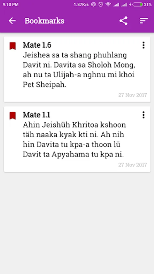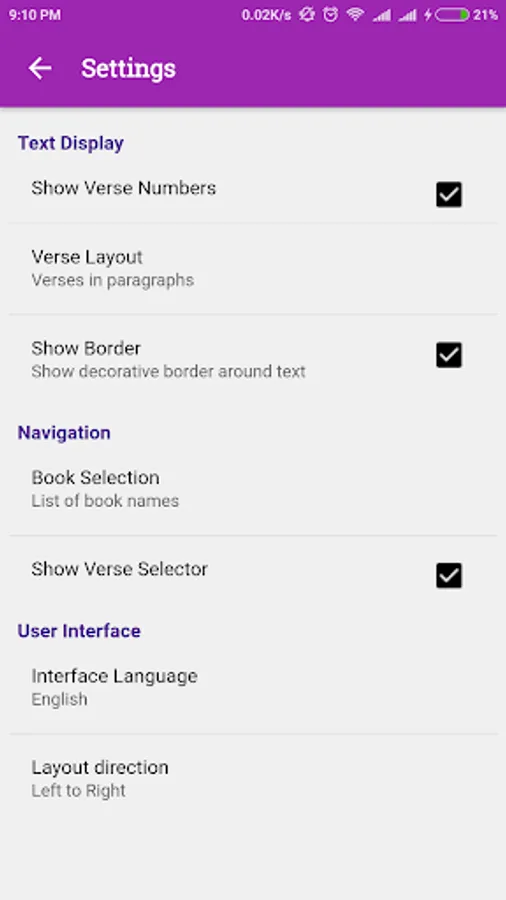 Features included are Search, Highlight, Bookmark, Add note, Customisable font size and theme and Customisable paragraph line by verse.