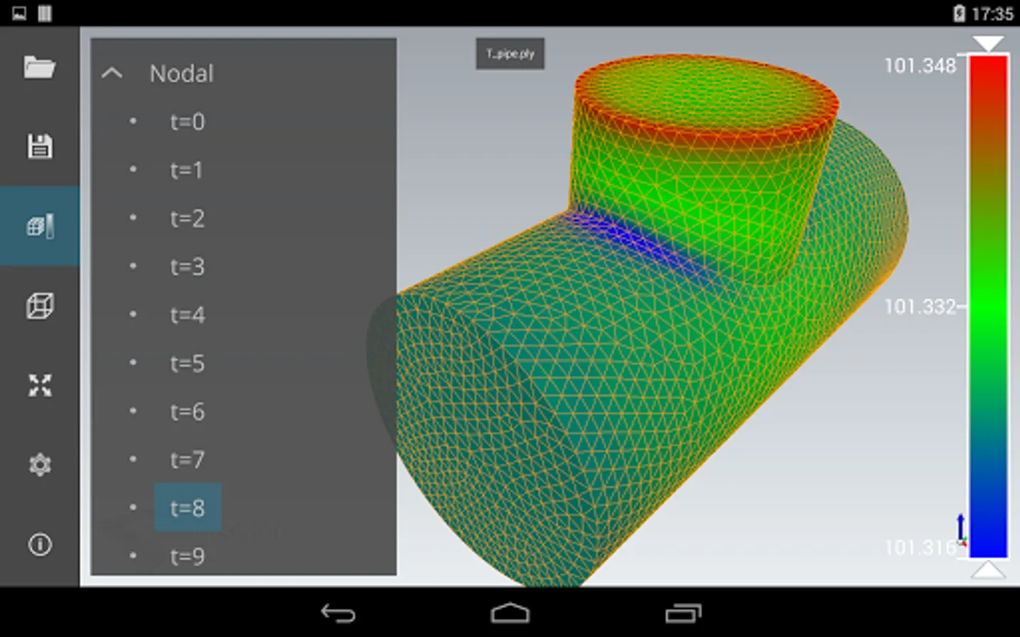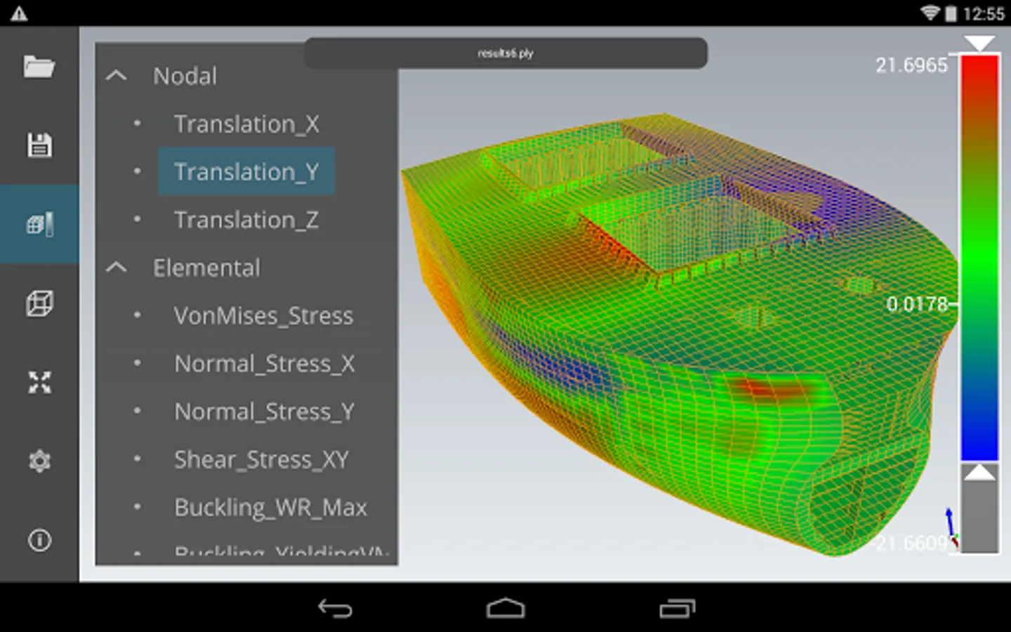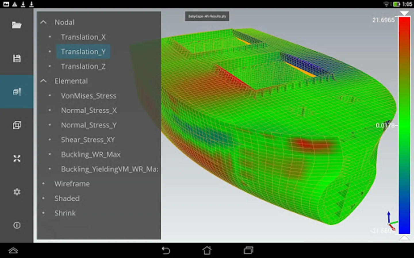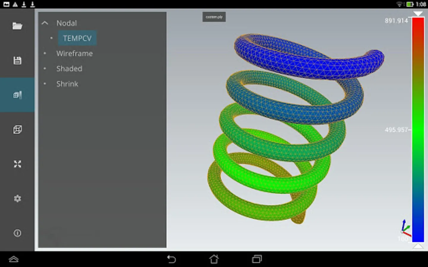 CAD Assistant allows you to view the mesh in wireframe, shaded, and shrink view. If mesh contains associated textures, colors, or scalar data, it can be viewed with elements colored according to the selected property. For scalar quantities interactive color scale is shown, providing controls to manipulate the range of displayed quantities.