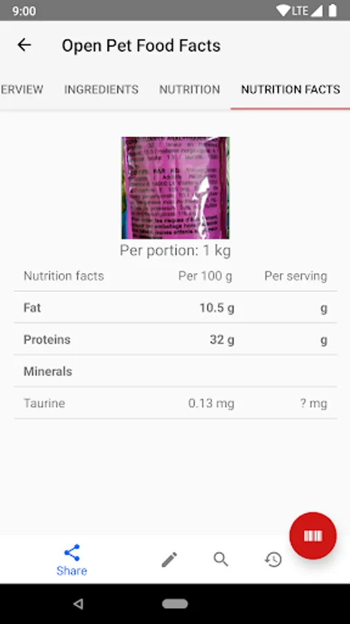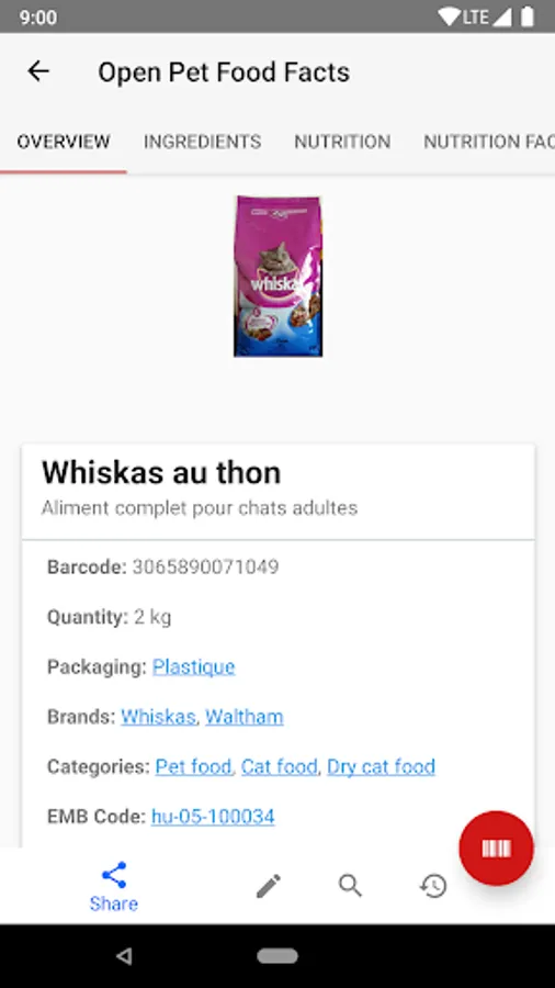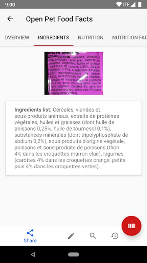 Scan pet food products or their barcode to obtain data on ingredients, additives and nutrition facts.