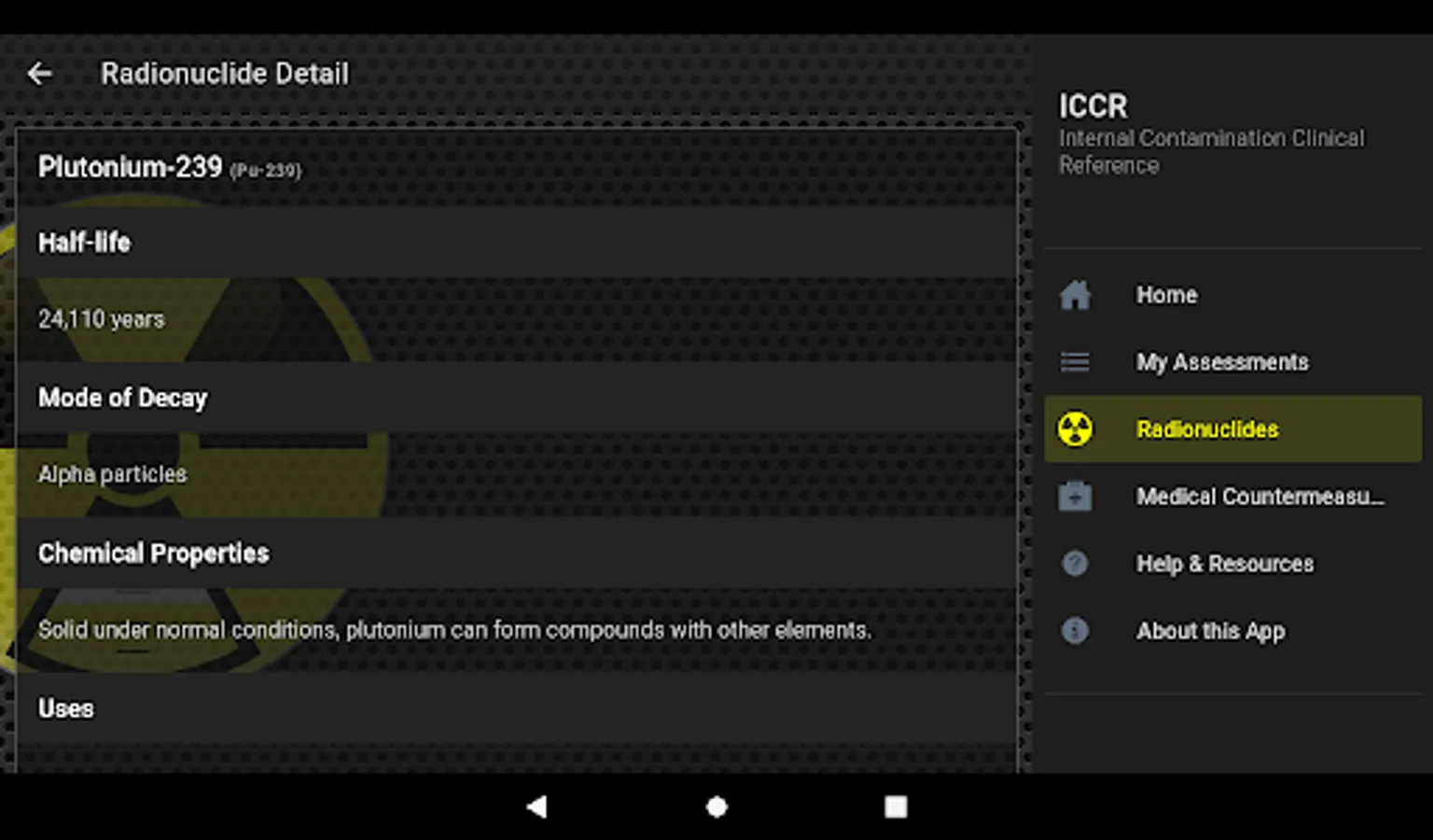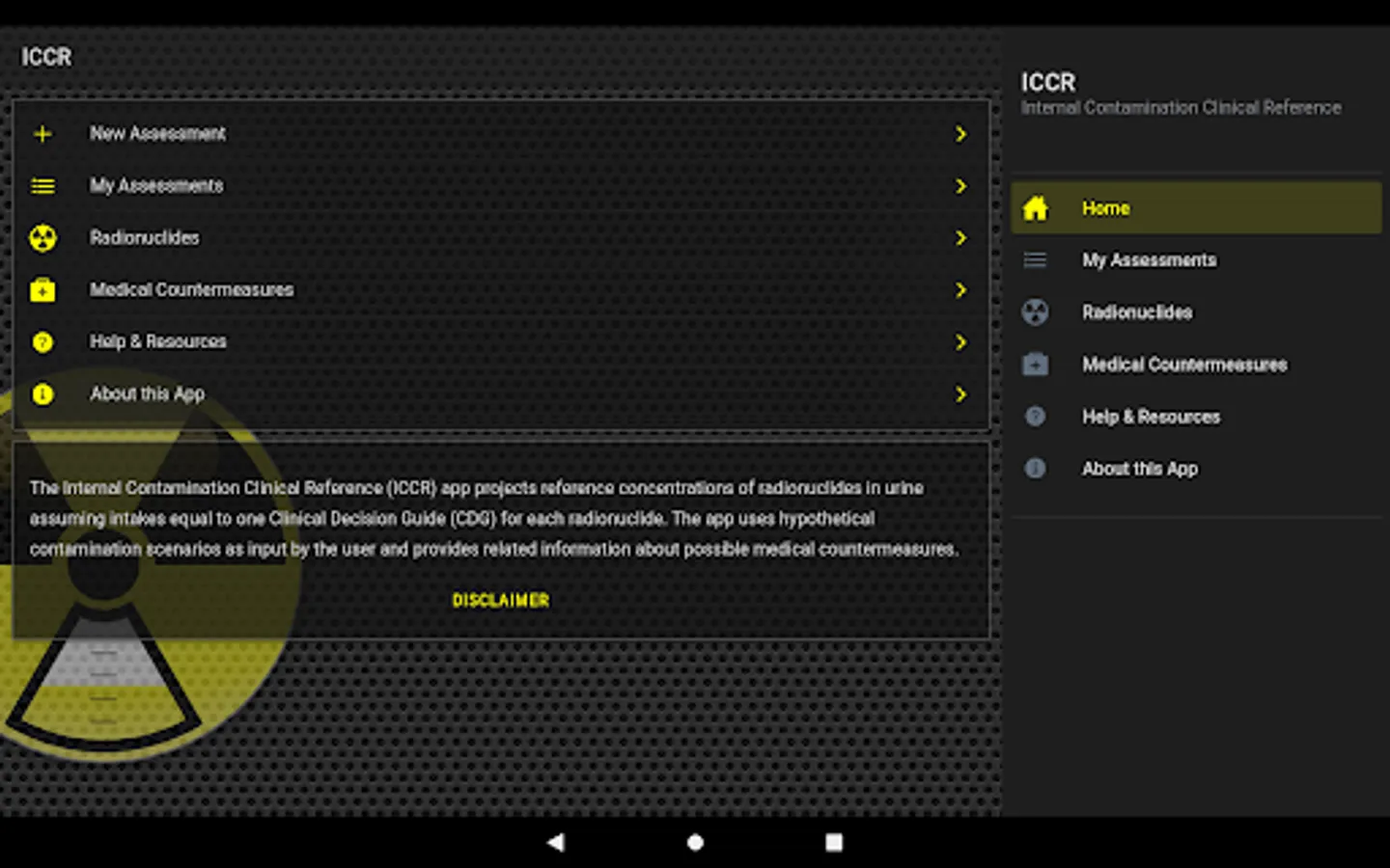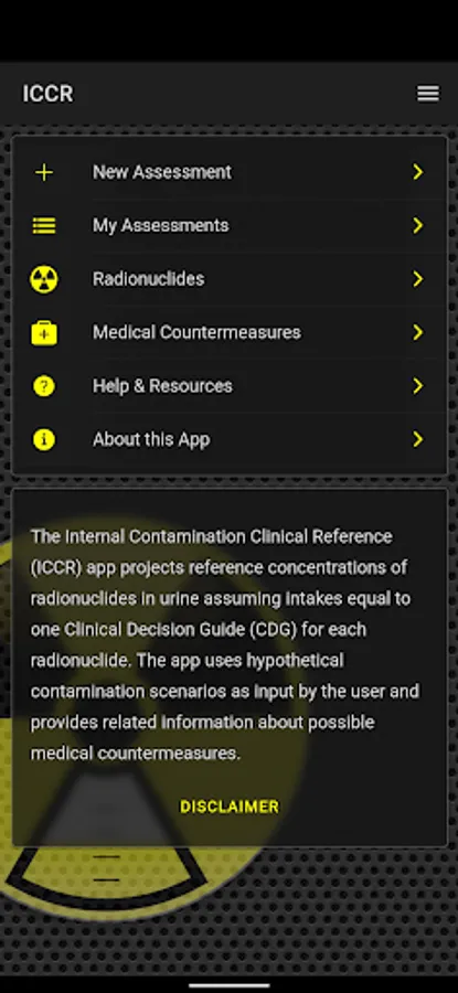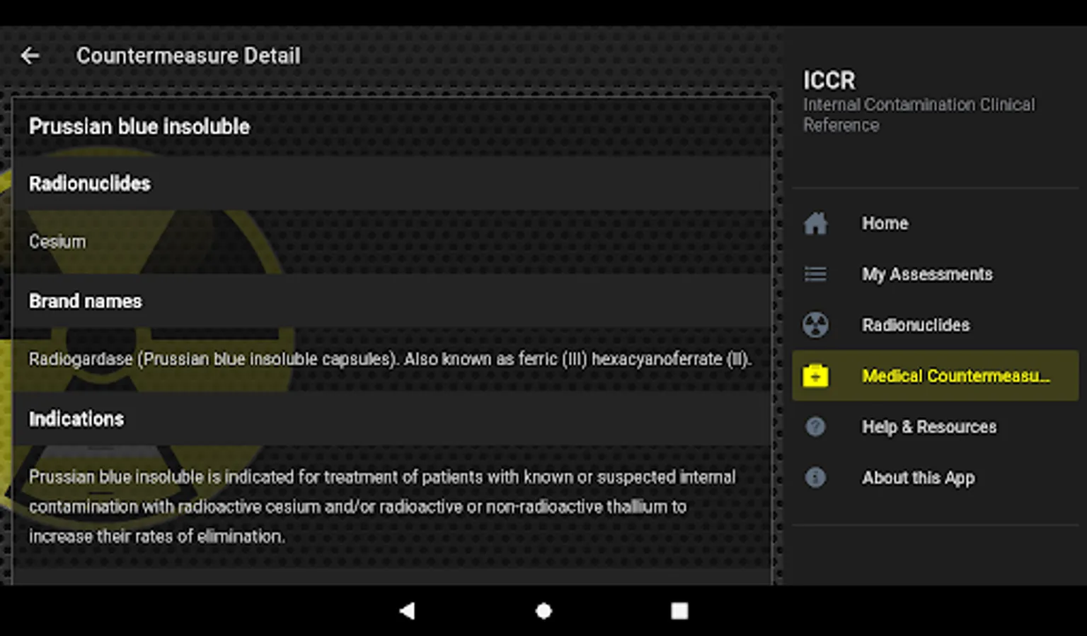 The Internal Contamination Clinical Reference app is a reference tool to be used for educational and informational purposes only. The app provides information about internal contamination with a number of radionuclides and their medical countermeasure. The app estimates reference concentrations of radionuclides in urine using standard biokinetics models and assuming intakes equal to one Clinical Decision Guide (CDG) for each radionuclide based on hypothetical patient scenarios. The intended audience for the app is clinicians, health physicists, radiation safety officers, medical and public health laboratory scientists, or any other professional interested in internal contamination with radioactive materials and their medical therapy. Some basic understanding of concepts behind internal contamination and internal dosimetry are required to fully benefit from this application. The Internal Contamination Clinical Reference app features: