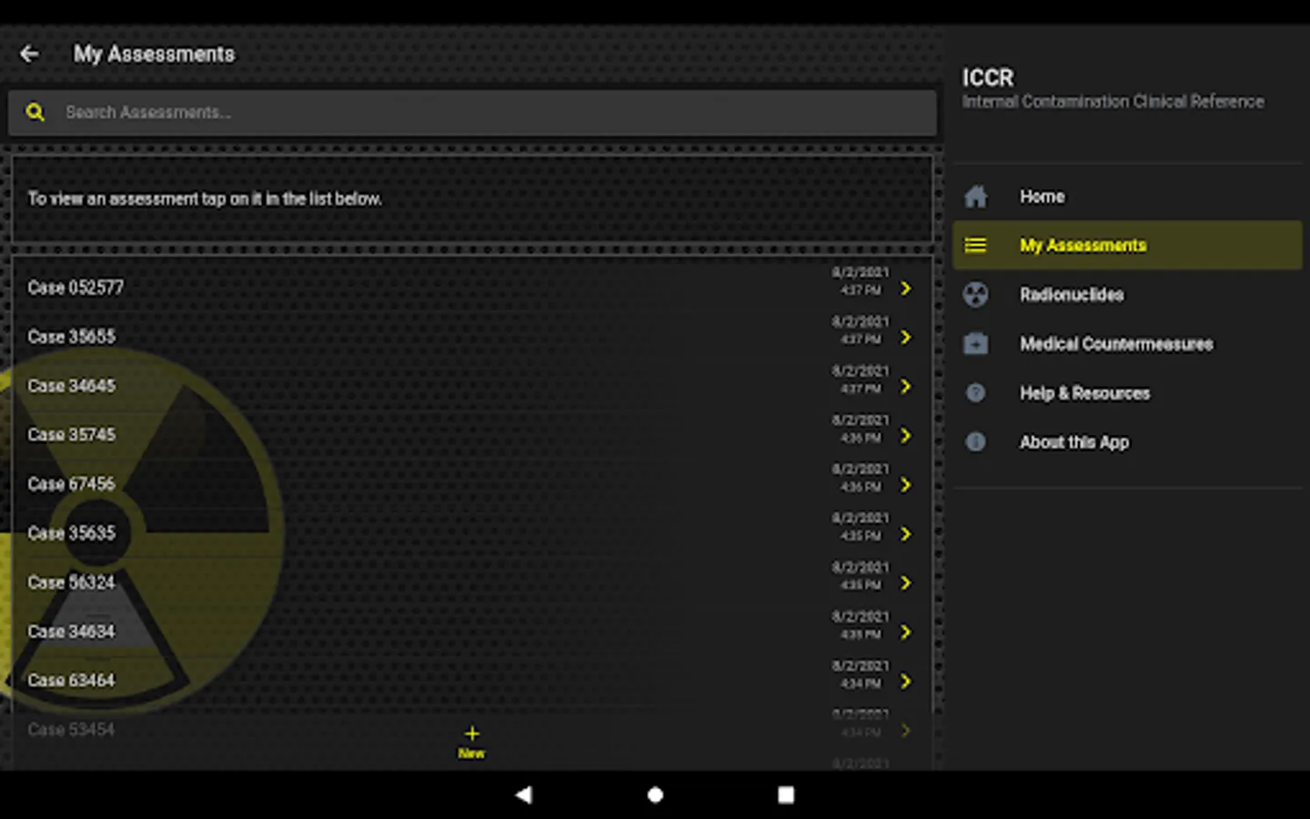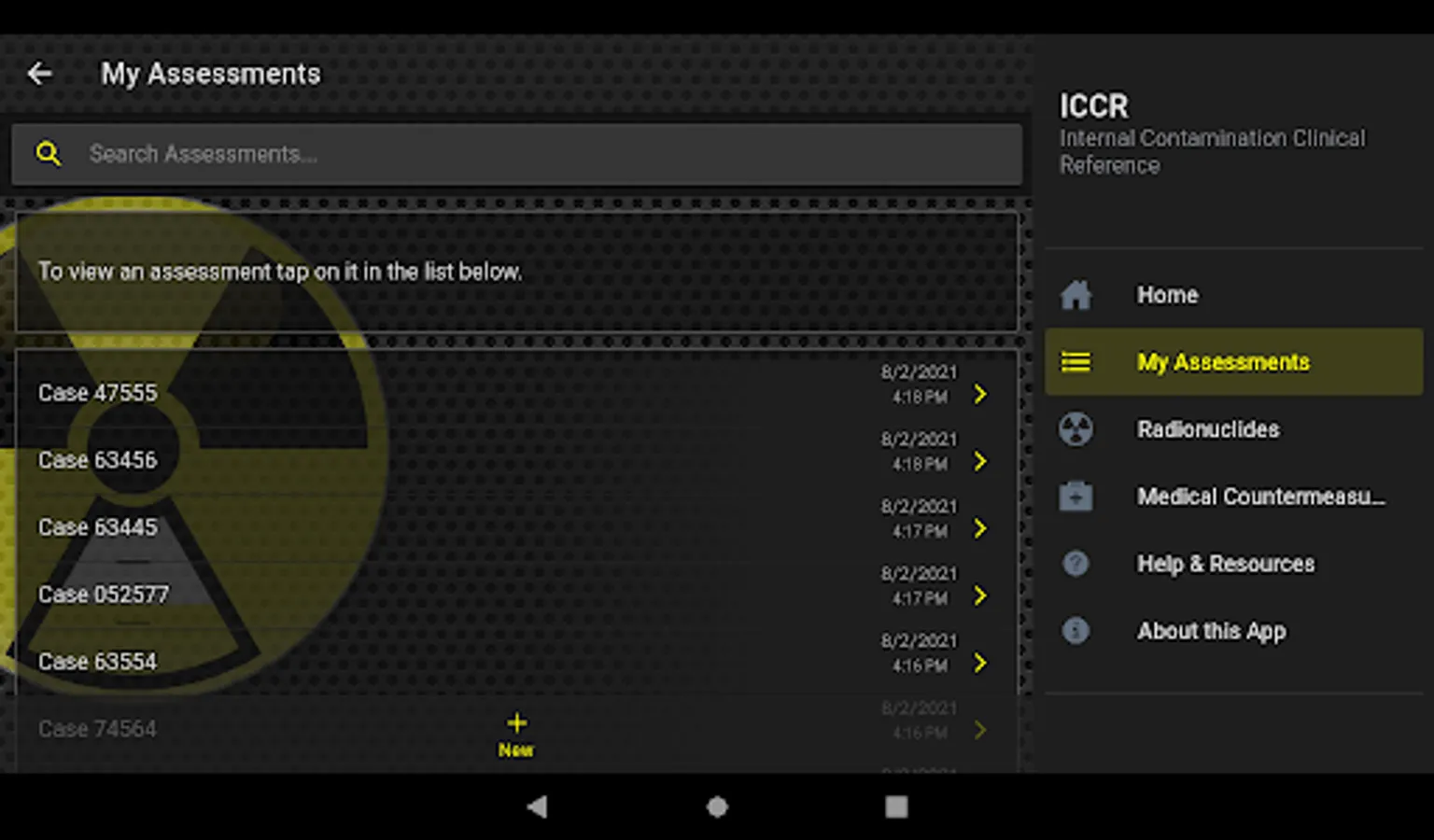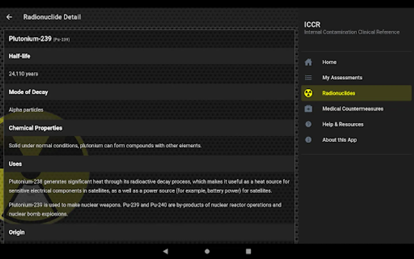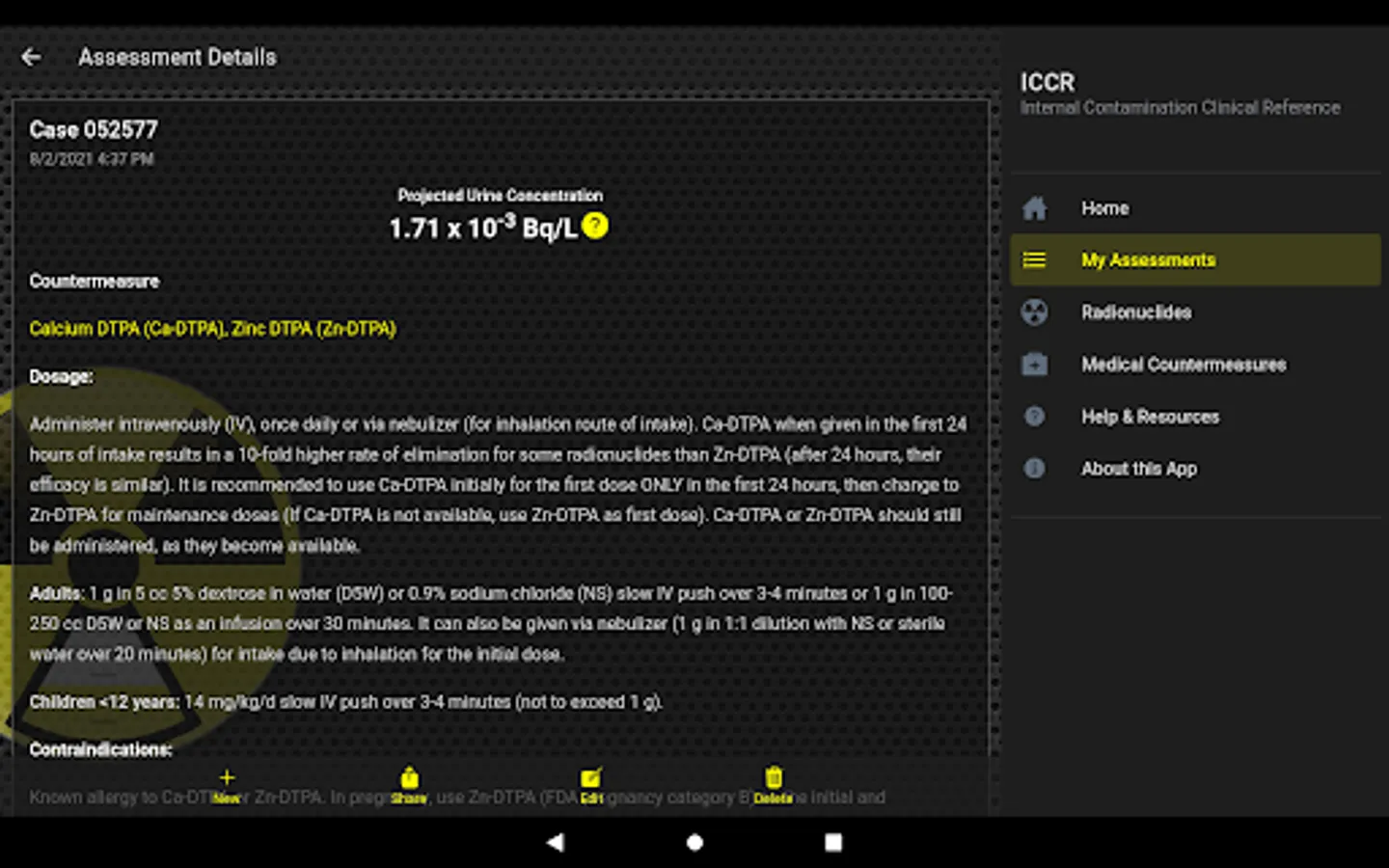 The Internal Contamination Clinical Reference app is a reference tool to be used for educational and informational purposes only. The app provides information about internal contamination with a number of radionuclides and their medical countermeasure. The app estimates reference concentrations of radionuclides in urine using standard biokinetics models and assuming intakes equal to one Clinical Decision Guide (CDG) for each radionuclide based on hypothetical patient scenarios. The intended audience for the app is clinicians, health physicists, radiation safety officers, medical and public health laboratory scientists, or any other professional interested in internal contamination with radioactive materials and their medical therapy. Some basic understanding of concepts behind internal contamination and internal dosimetry are required to fully benefit from this application. The Internal Contamination Clinical Reference app features: