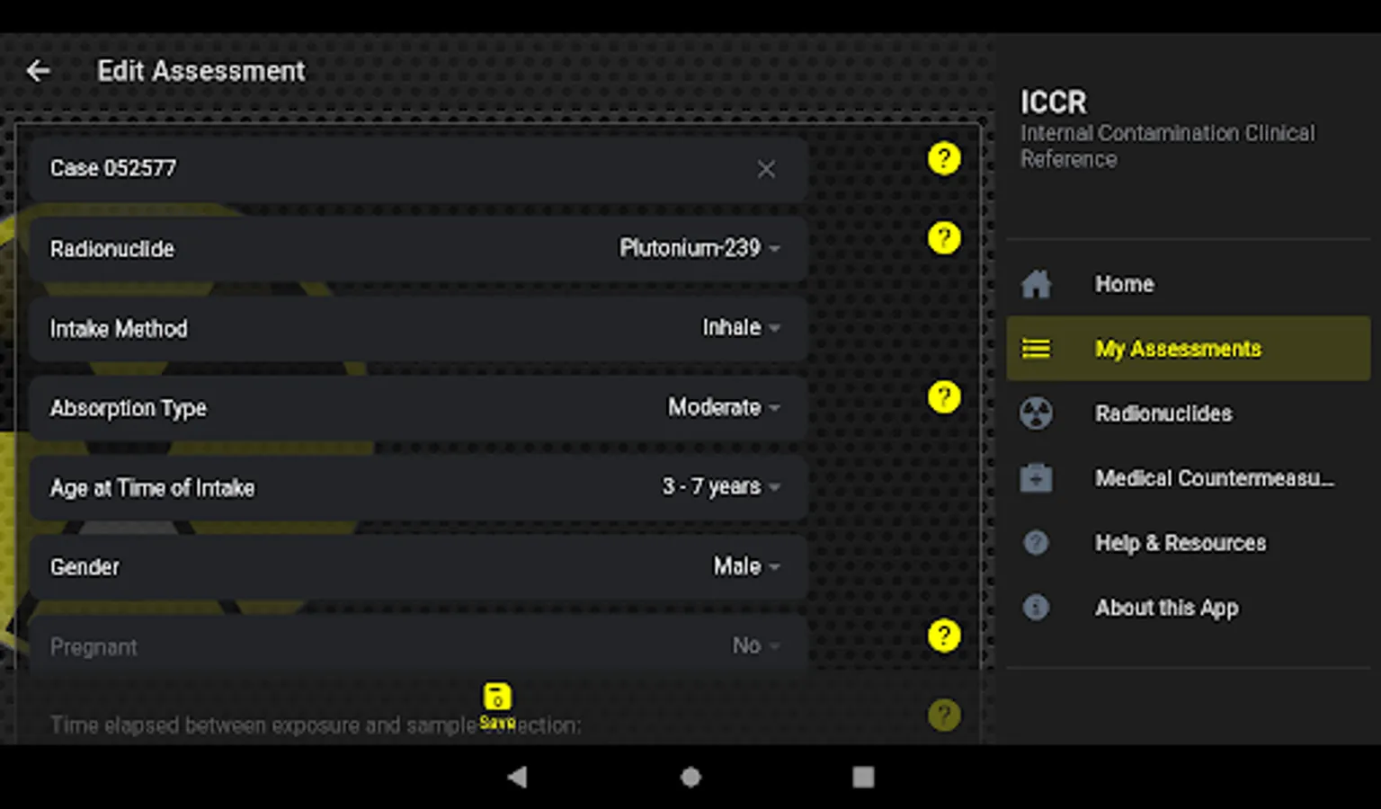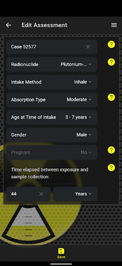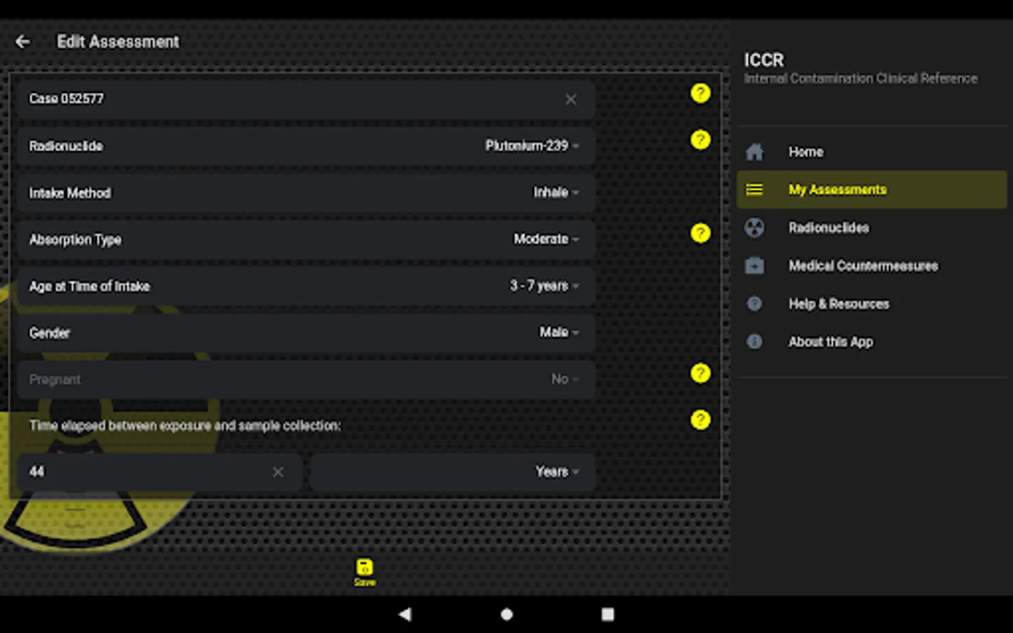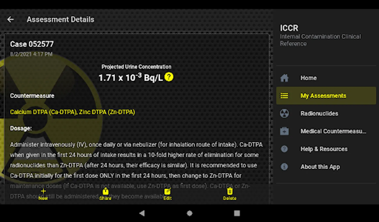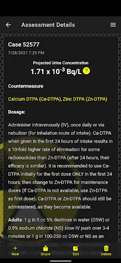 - Users can perform assessments based on hypothetical patient scenarios with each assessment projecting a reference concentration of radionuclides in urine based on user input