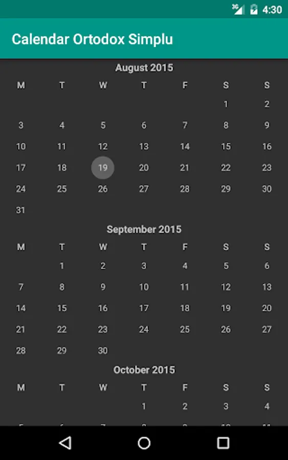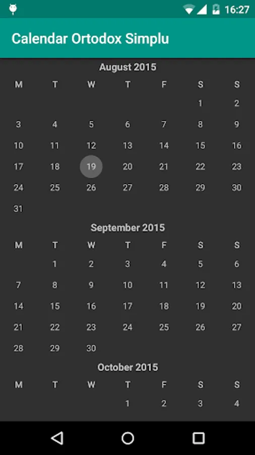 Afiseaza calendarul Bisericii Ortodoxe Romane, calculand data Pastelui automat, in functie de an (precum si a celorlalte sarbatori cu data schimbatoare).