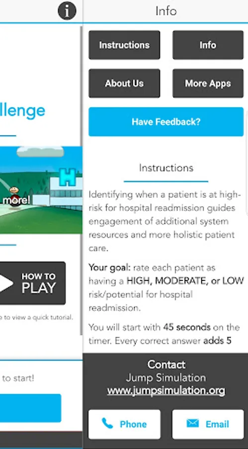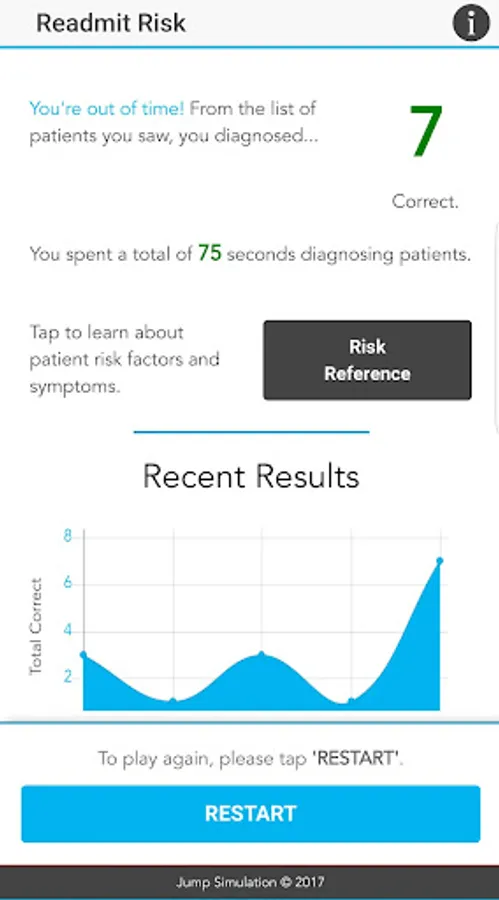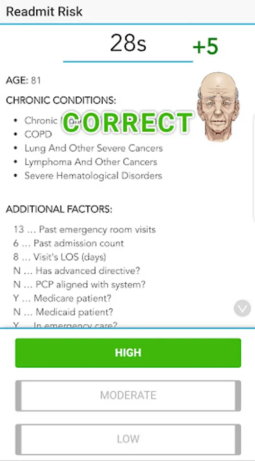 This app uses an approach that categorizes a patient’s risk level of hospital readmission into low, moderate, and high; an approach that some hospital systems use to determine appropriate treatment needs. Users will work against the clock as they aim to correctly identify the risk level and earn the highest possible score. The user scores are presented on the results screen to encourage replay and improvement.