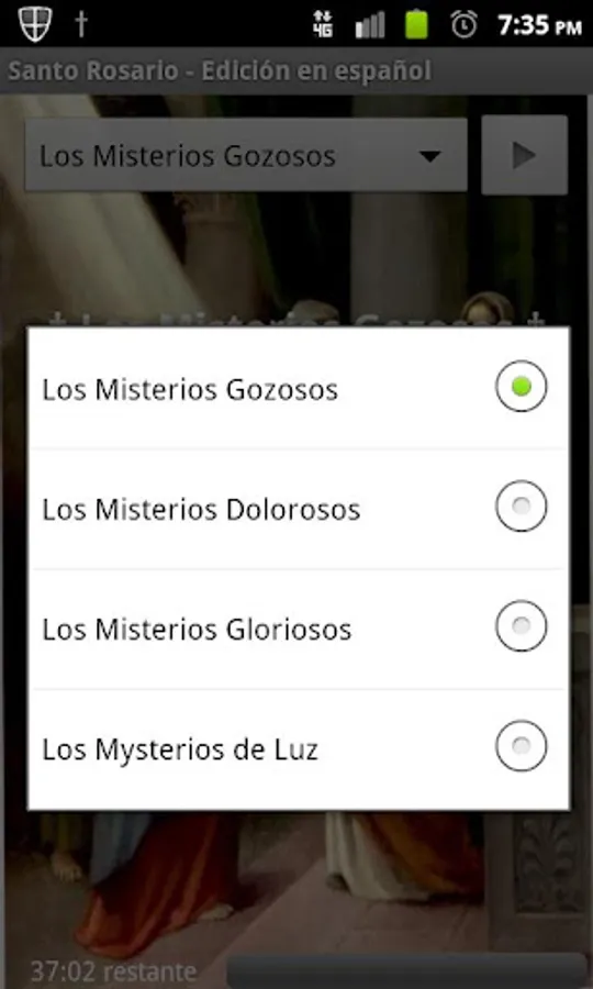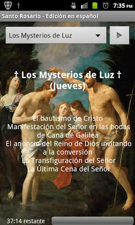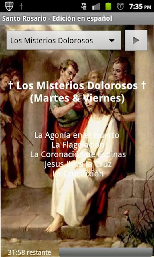 The appropriate mystery is loaded for that particular day when the application launches, or you can manually choose which mysteries you would like to pray along with.