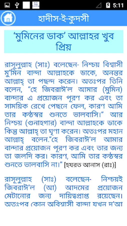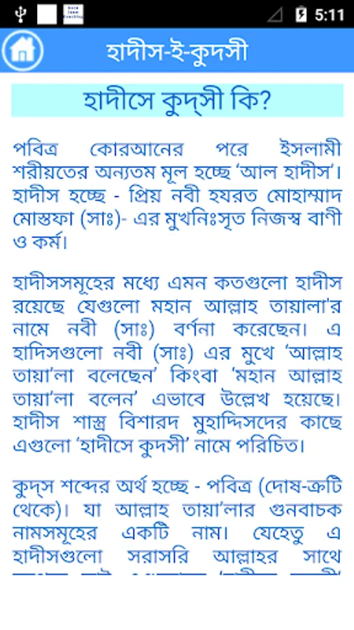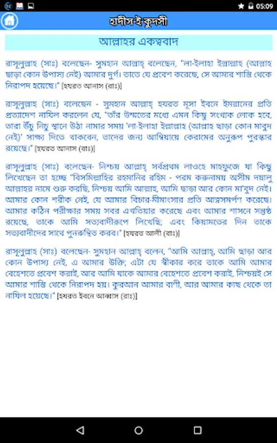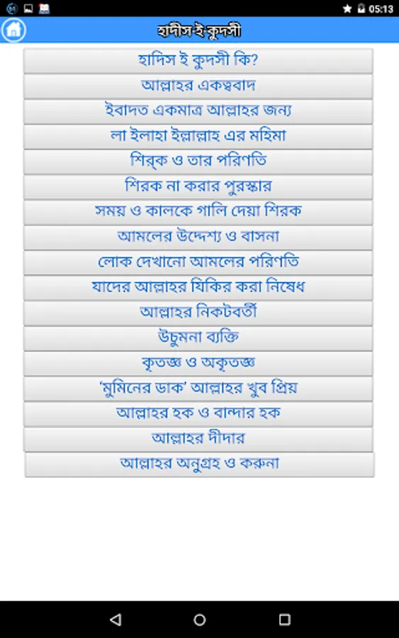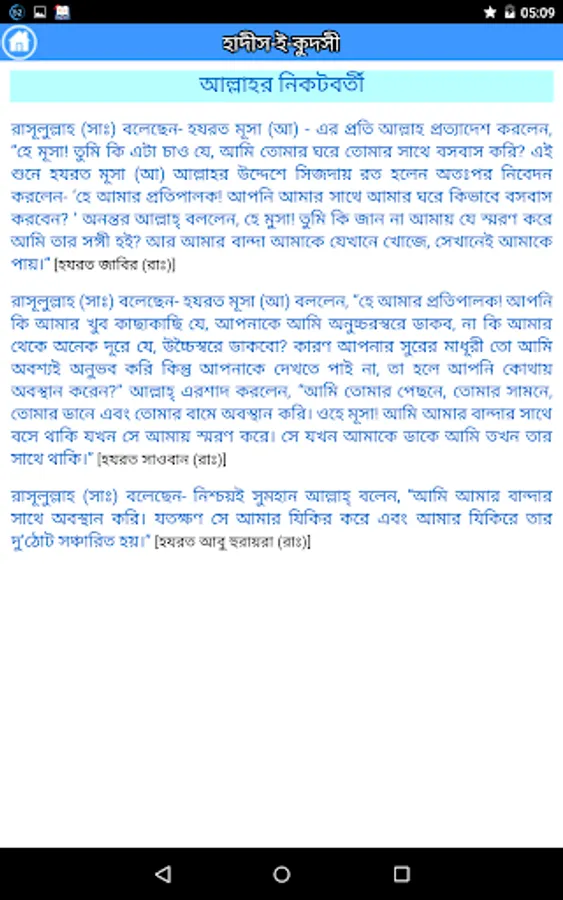 This apps includes the Sacred Narration (al-Hadith al-Qudsi) is attributed to Allah, Most High, and related from Him. The Messenger of God (Allah bless him and give him peace) would receive the meaning from Allah, by way of inspiration or dream, and then he (Allah bless him and give him peace) would inform his community of this in his own words.