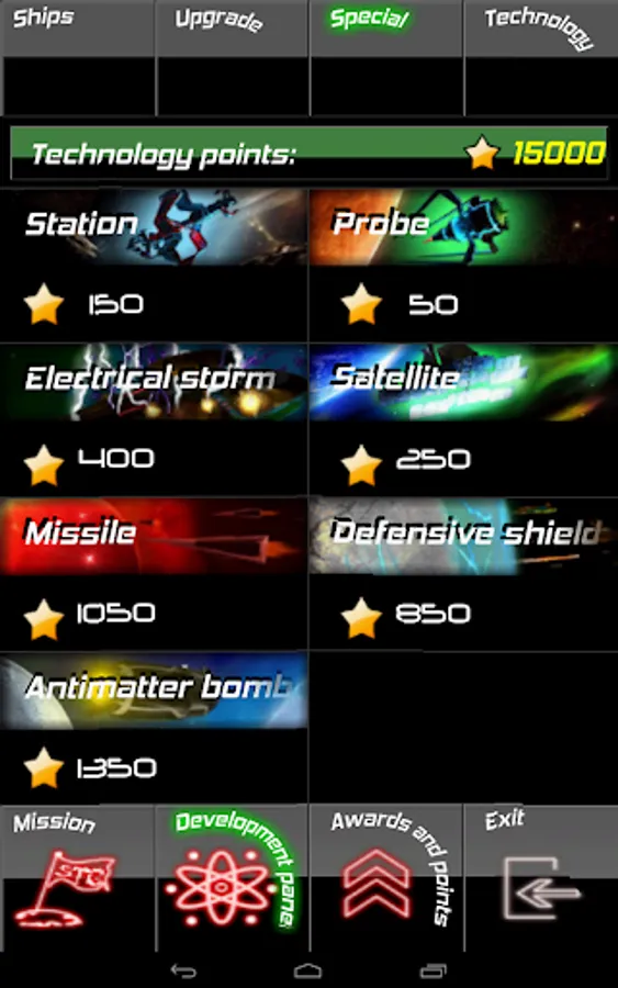 7 special technology to spread power and chaos. For instance: nuclear missile, electrical storm, planetary shield, mining station.