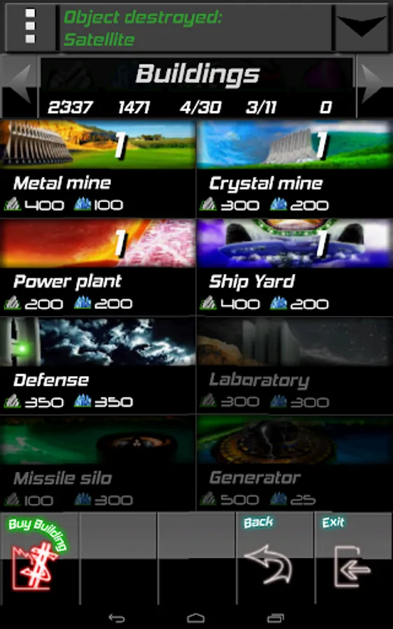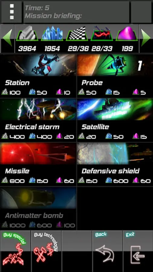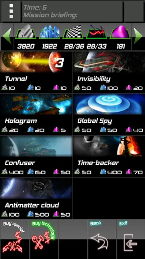 7 technologies to raise your domination. For instance: turn back in time, planetary tunel, invisibility, hologram, antimatern layer.