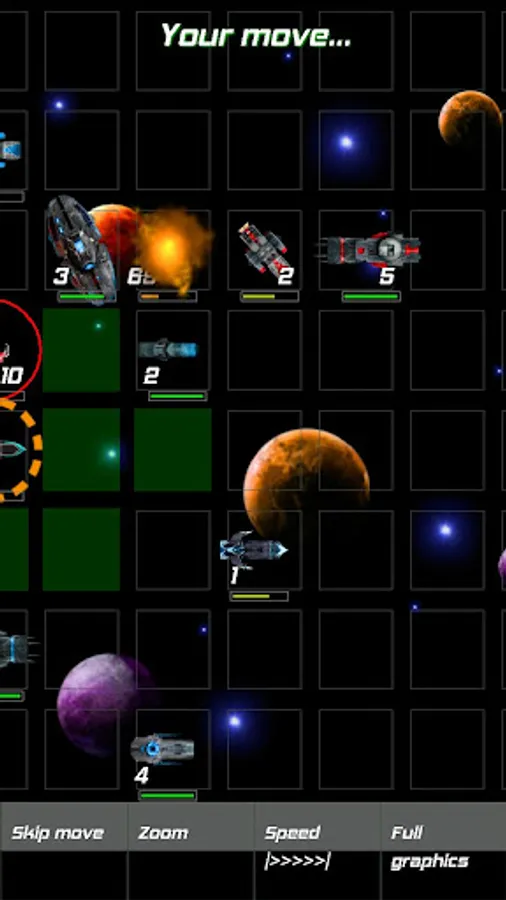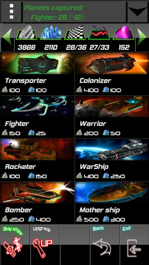 8 ships: Transporter, Fighter, Warrior, Rocketer, Warship and MotherShip.