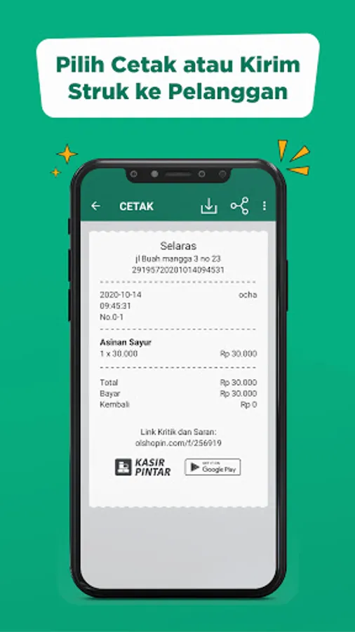 - Monitor your stocks, transactions records, and reports at our exclusive website http://kasirpintar.co.id