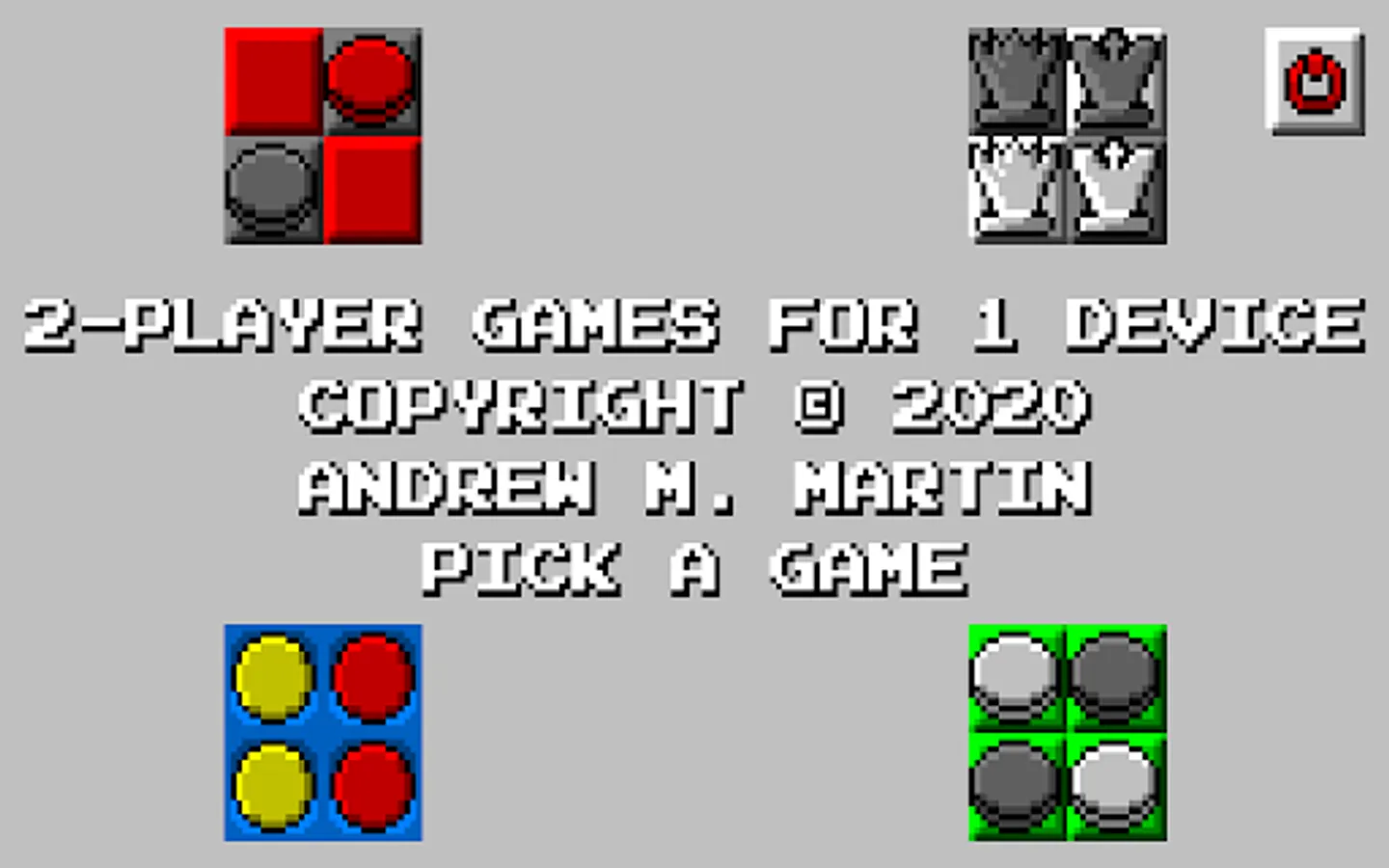 Four classic board games in one app! Two players can take turns playing these games on one device: Chess, Checkers (or Draughts), Othello (or Reversi), Four In A Row (try to connect four pieces in a row). Nothing fancy. No online games, no AI for solo games. No ads, no connection required, no special permissions required. Just four classic games in one small package.