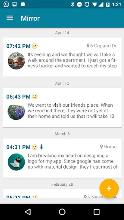 Mirror is a free offline secure dairy / journal app that enables you jot down your thoughts and ideas, add pictures, voice notes, track your mood, all in one place!