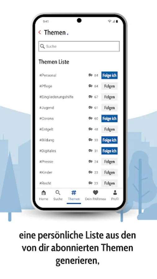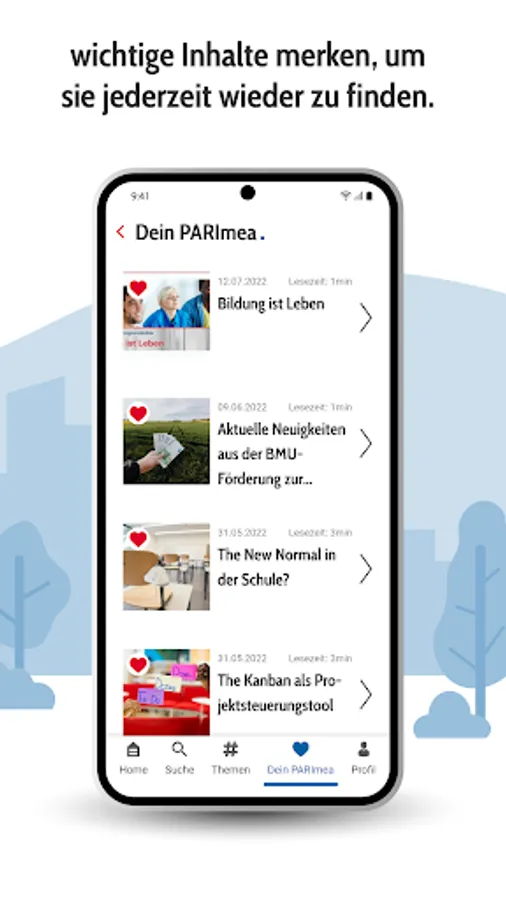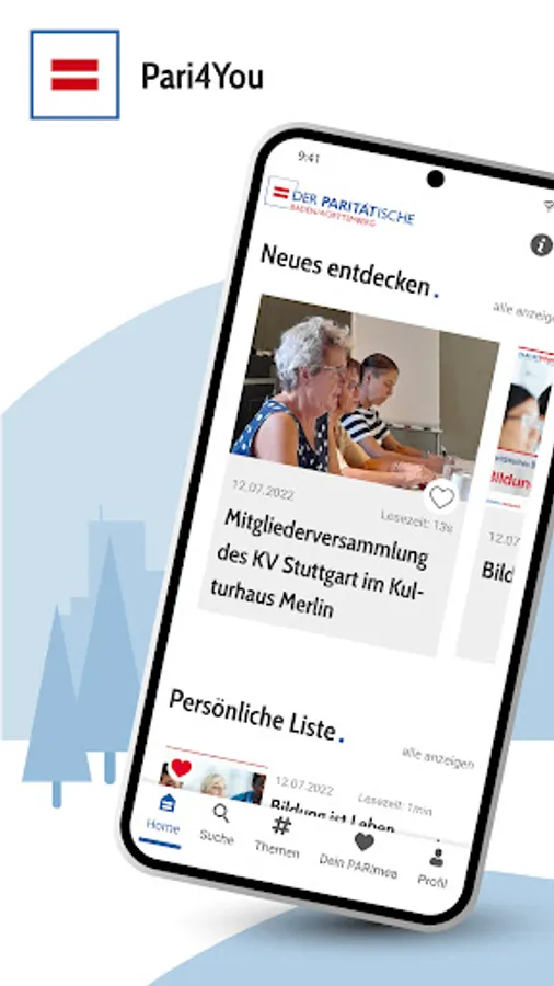 Pari4You, the free app for all members and those interested, provides you with the latest news, specialist information and press releases from the parity national association. Subscribe to individual topics (e.g. migration, children, addiction, work, inclusion, care, education) that interest you and always be well informed. Mark interesting articles to read later.