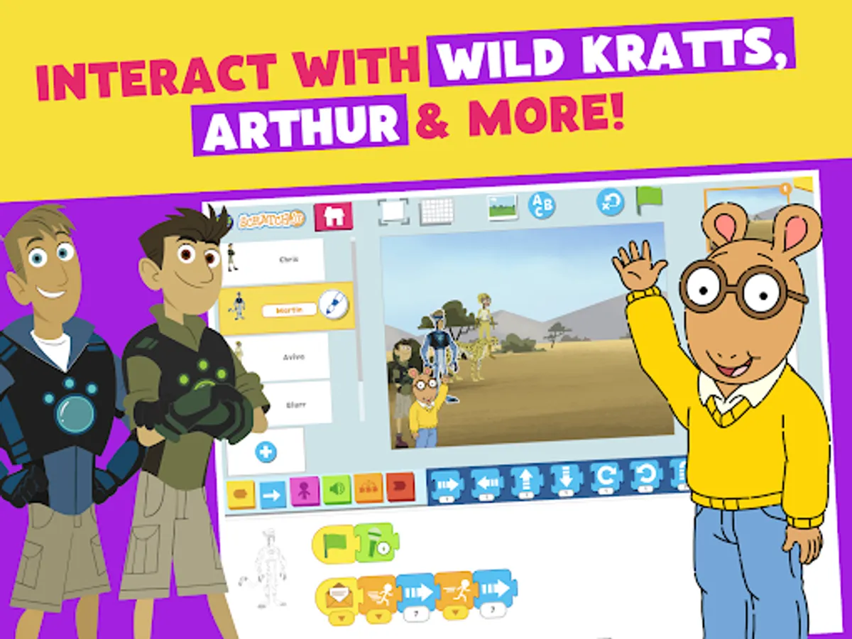 PBS KIDS ScratchJr encourages kids create their own interactive stories and games. Learn coding basics through programing games and activities featuring characters from hit PBS KIDS shows like Wild Kratts, Molly of Denali, Odd Squad, Arthur, Nature Cat, Peg + Cat, and Ready Jet Go!