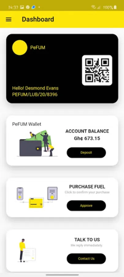 - Top up your PeFUM wallet via visa cards, master card and mobile money. Purchase fuel in any fuel station in Ghana at your own convenience.