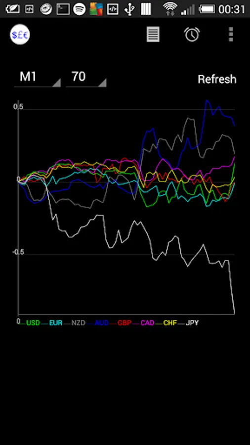 For Forex traders - shows a graph of Absolute Currency Strength (Please read http://en.wikipedia.org/wiki/Absolute_currency_strength to understand the concepts).