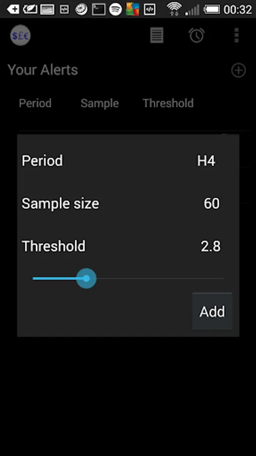 Click on 'Alarm Clock' icon, click the plus sign, see a dialog to add an alert.