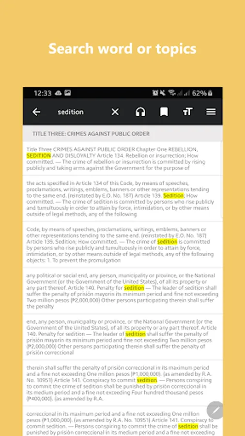Philippine Law Library App contains codals in an easy to read format with search functionalities, audio read mode, notes, text highlight and other reading preferences that will enhance your reading experience.