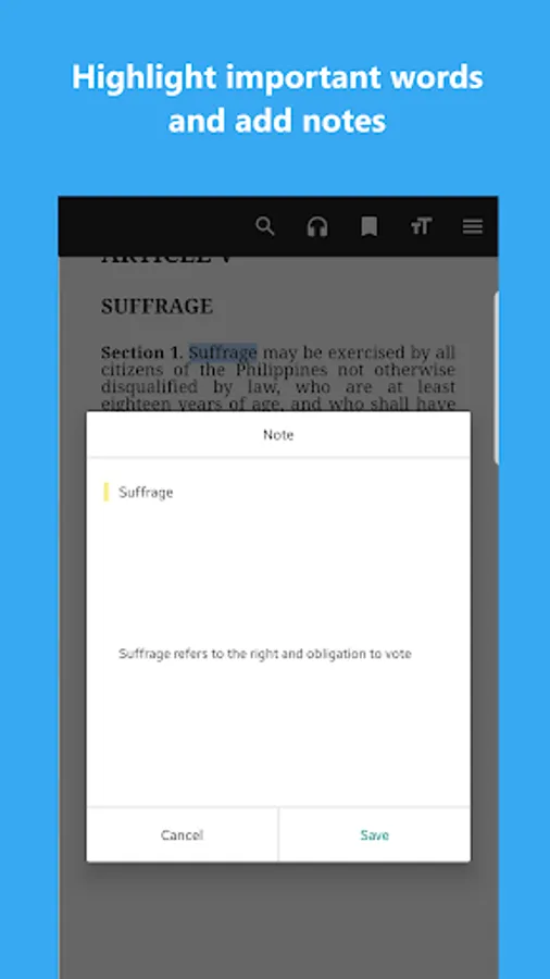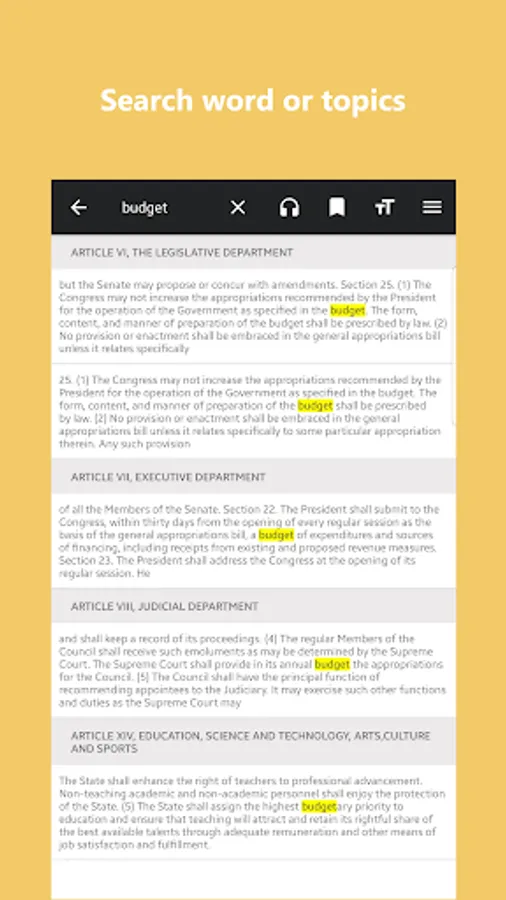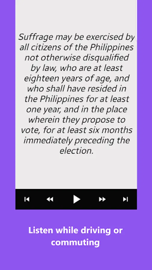 The 1987 Philippine Constitution in an easy to read format with search functionalities, audio read mode, notes, text highlight and other reading customization that will enhance your reading experience of The Philippine Constitution.