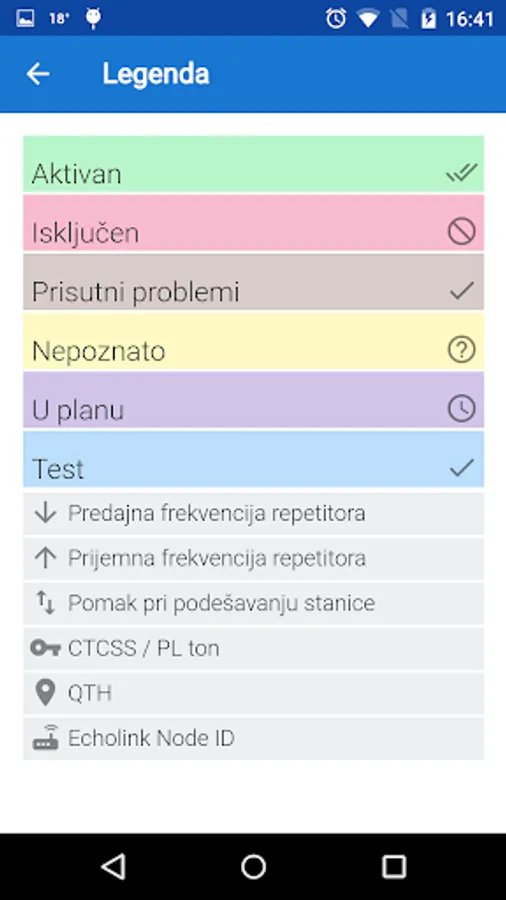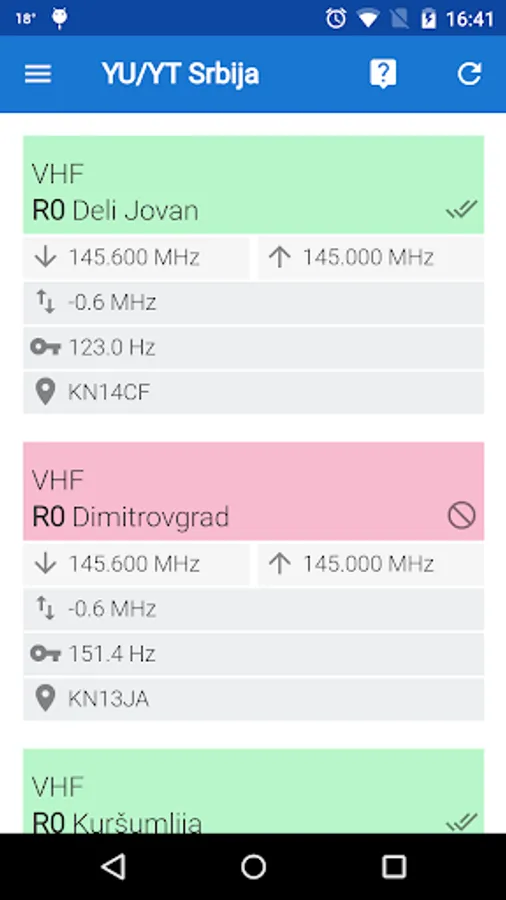 View data about amateur radio repeaters, test radio nodes, echolink nodes, APRS digipeaters on the area of former SFRJ. In order to minimize traffic data is retreved at first start from the ham.pirot.org web site and stored on the device. To retrieve latest data You must manualy reload.