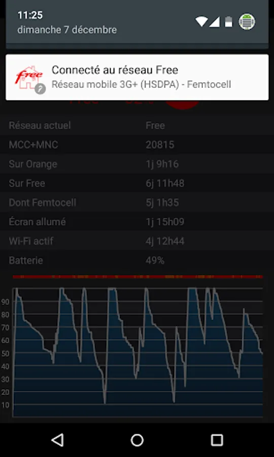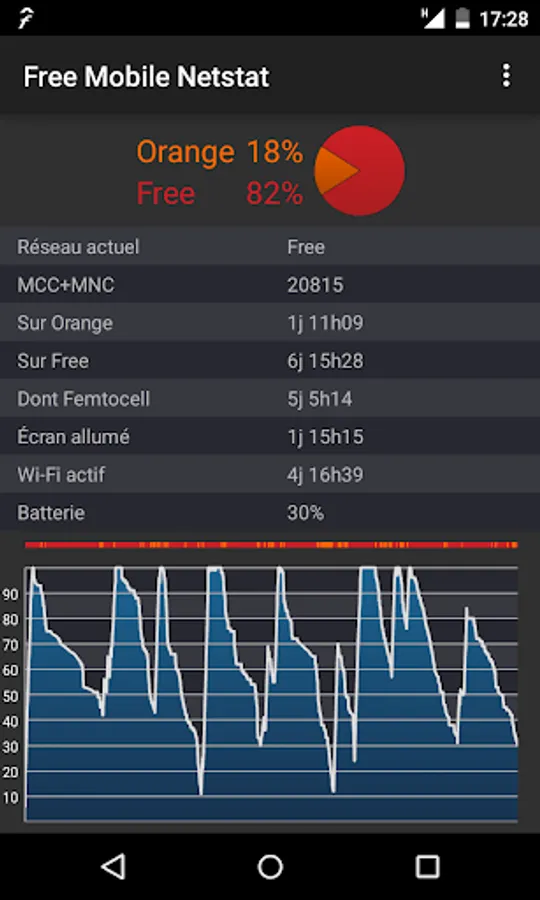 At any moment, an icon in the notification bar displays the connected network: Free Mobile or Orange roaming. Clicking on the icon displays the percentage utilization of each network with detailed information, and battery level according to the operator. The type of antenna connected is continuously displayed in the notification bar.