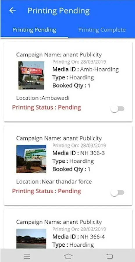 The user or a monitoring executive can check the status of mounting pending and update them. He can add geo-location and other details of media, new display photographs, Update the status of mounting and monitoring.