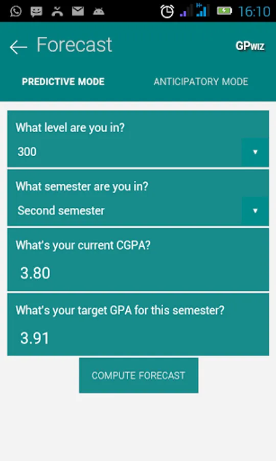 GPWiz application is a CGPA tool created to assist students in proper planning for academic sessions, it is designed to give the students adept insight into how much work would be required of them to meet a target CGPA by the end of each semester.