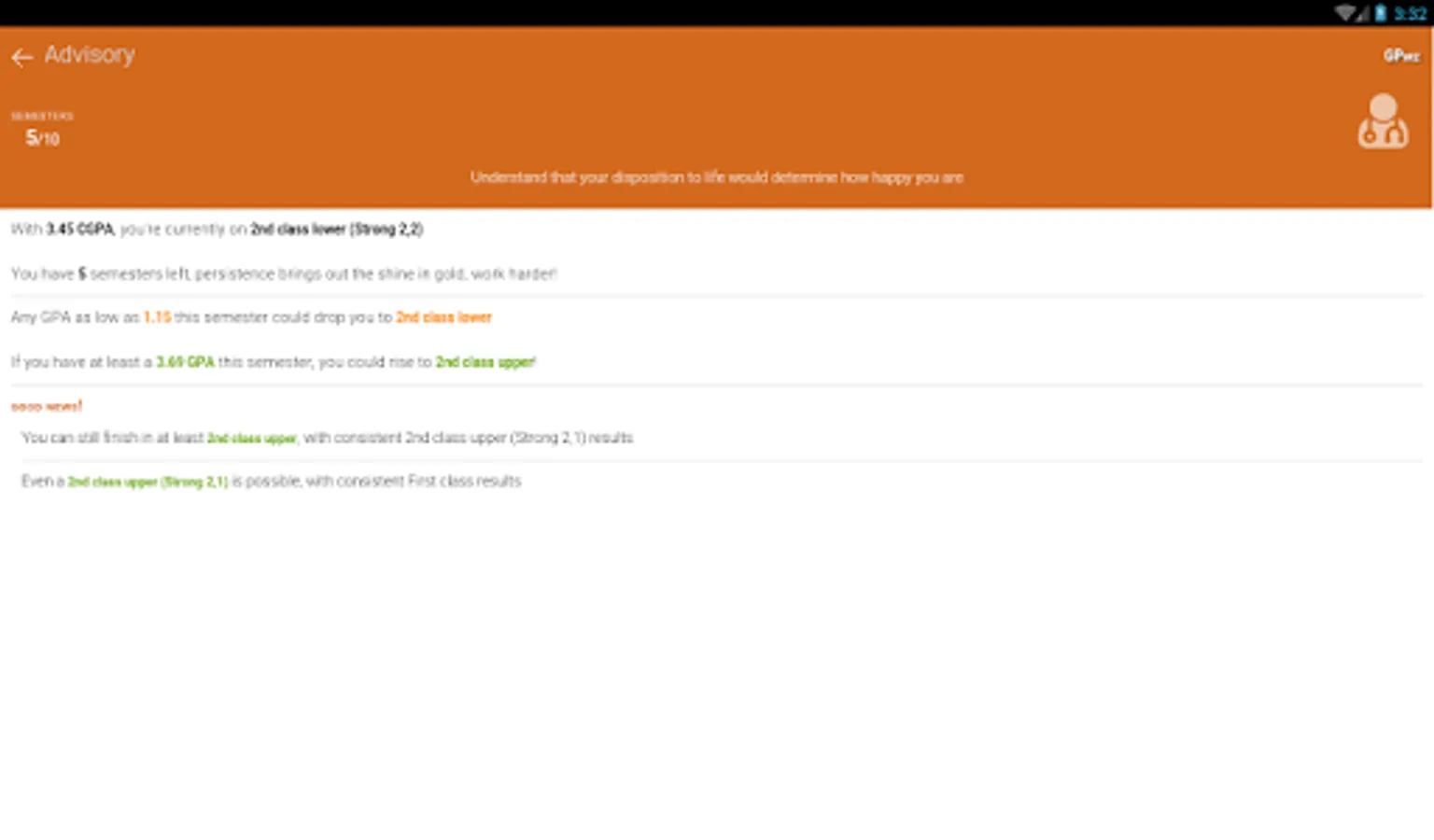 GPWiz is unlike other popular GPA calculators which center on helping students to compute their resulting GPA given scores in their courses and the corresponding load units. GPWiz would tell the student how having a certain GPA in the current semester would affect their CGPA, hence, a student can speculate what GPA he/she needs to attain in a semester to cross-over to the next grade level.