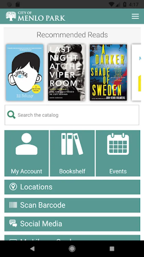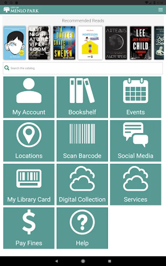 The Menlo Park Library app is your connection to the library's services from your mobile device. Check your account, pay fines, renew items, search the catalog, place holds and use your digital library card (eCard).
