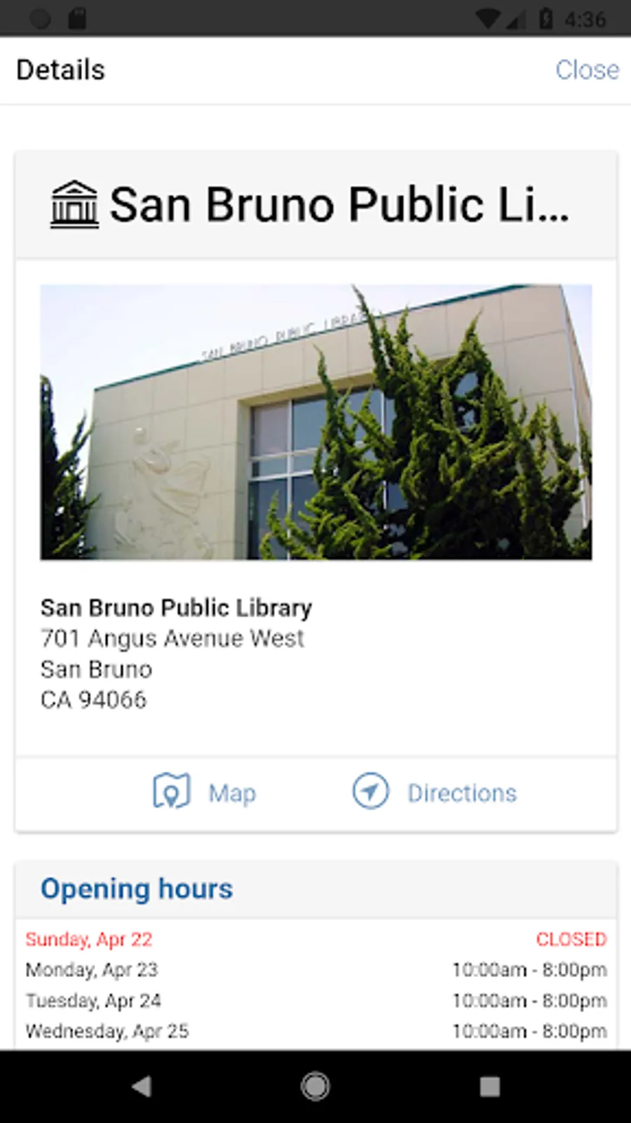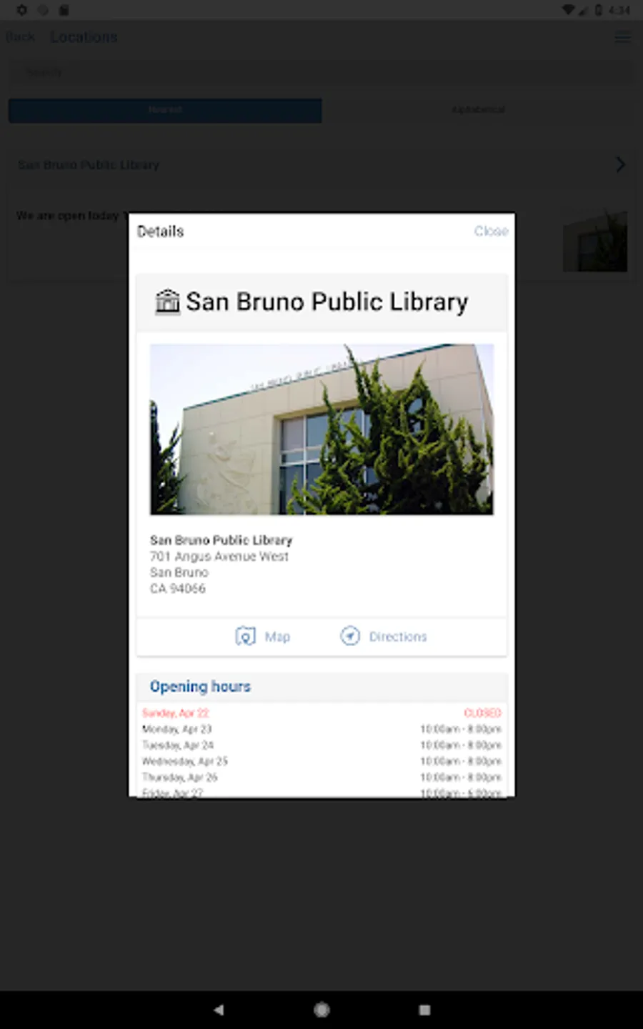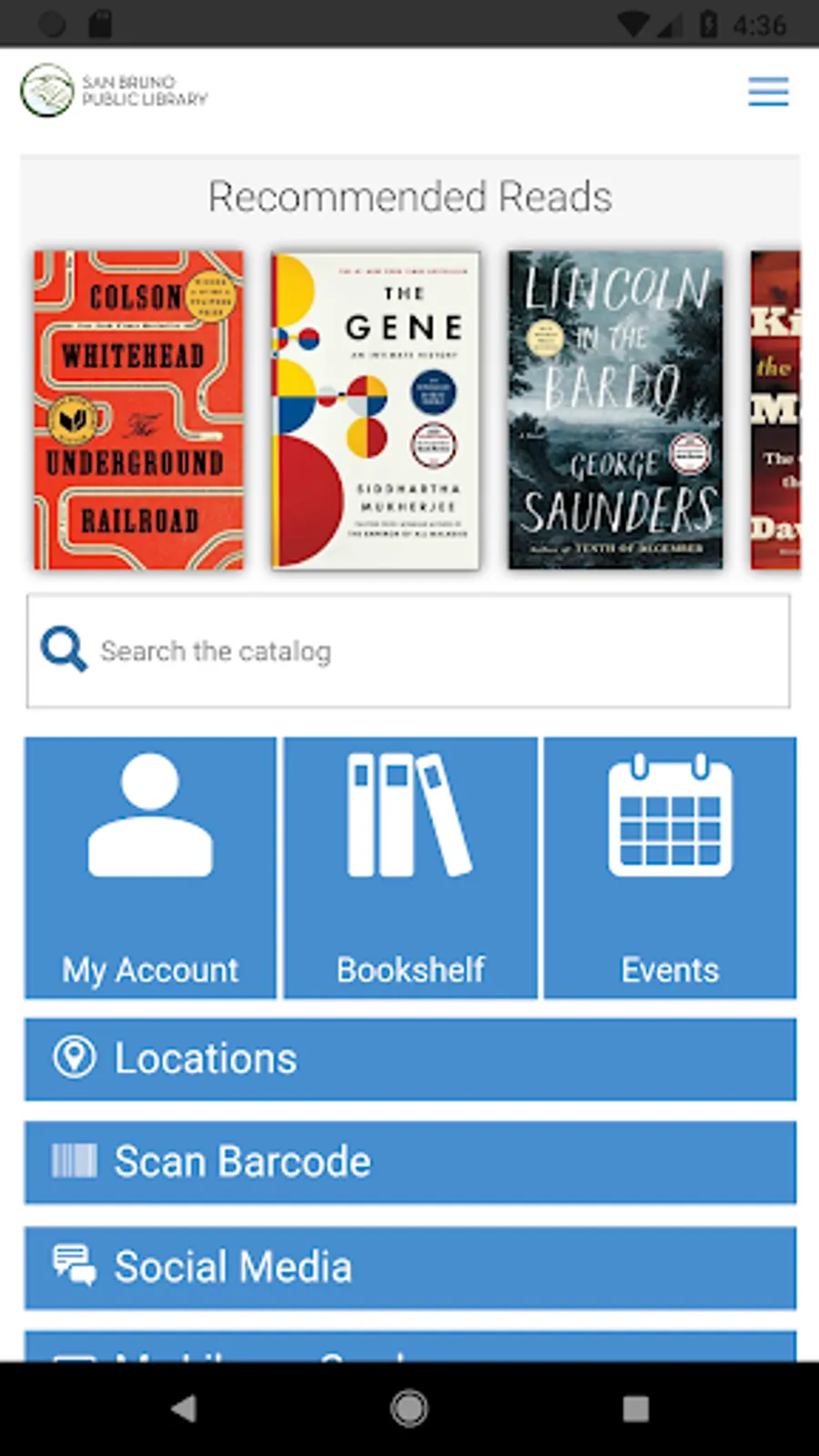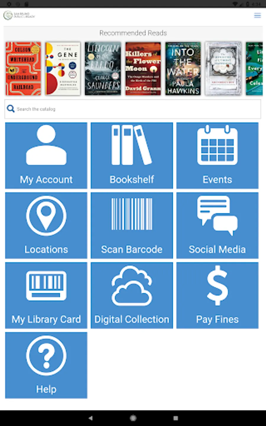 The San Bruno Library app is your connection to the library's services from your mobile device. Check your account, pay fines, renew items, search the catalog, place holds and use your digital library card (eCard).