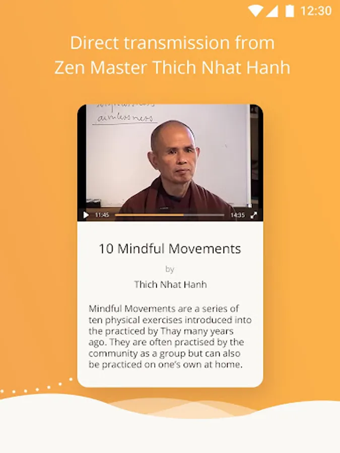 In Plum Village monasteries bells of mindfulness chime at regular intervals. Everybody stops and takes three mindful breaths to pause from their thinking or talking, breathe, and return to their bodies. The Bell of Mindfulness allows us to have the same reminder on our phone.